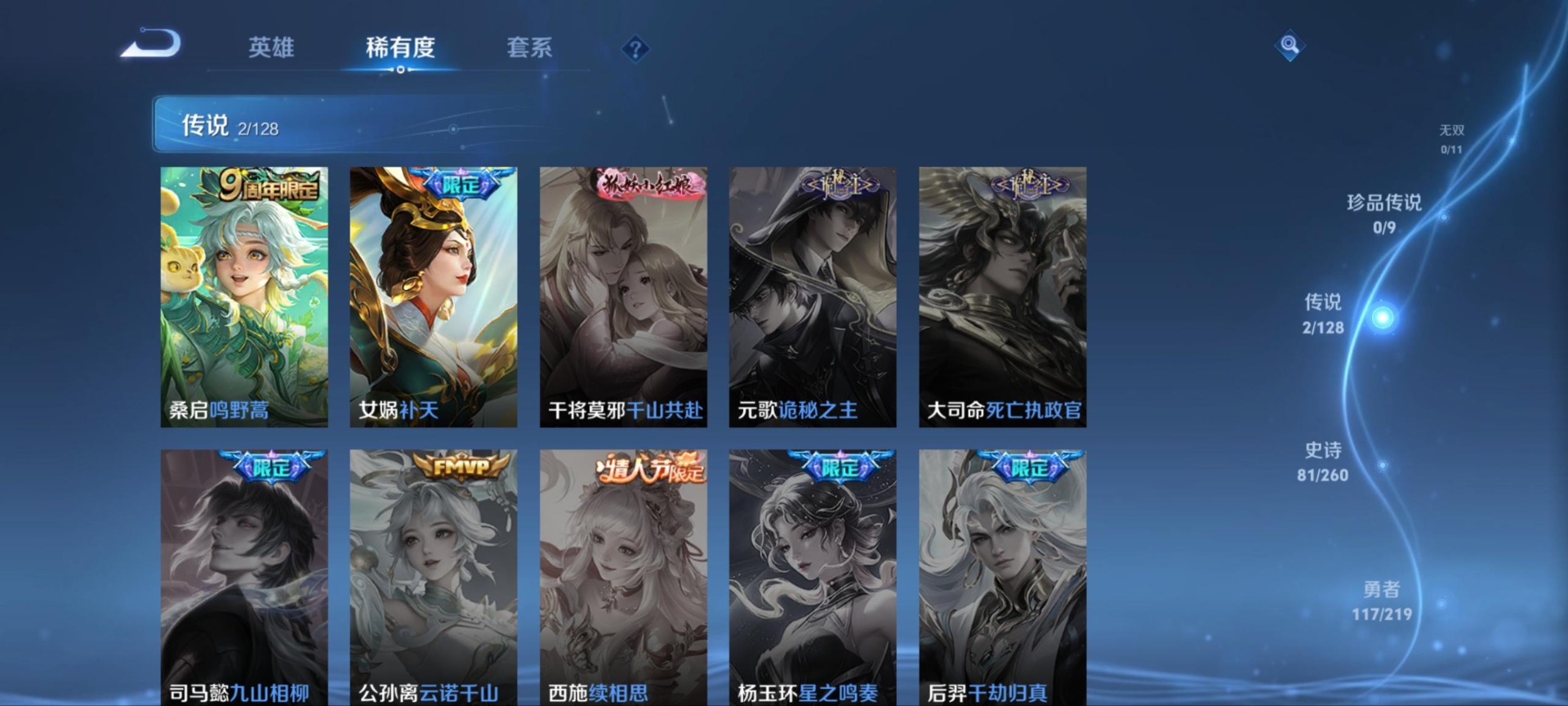 伽罗天狼溯光者,干将莫邪冰霜恋舞曲,后羿如梦令,裴擒虎李小龙,上官婉儿梁祝,花木兰默契交锋,马可波罗山海·玄木吟,桑启鸣野蒿,猪八戒猪悟能,女娲补天,孙悟空至尊宝,赵云引擎之心,关羽冰锋战神