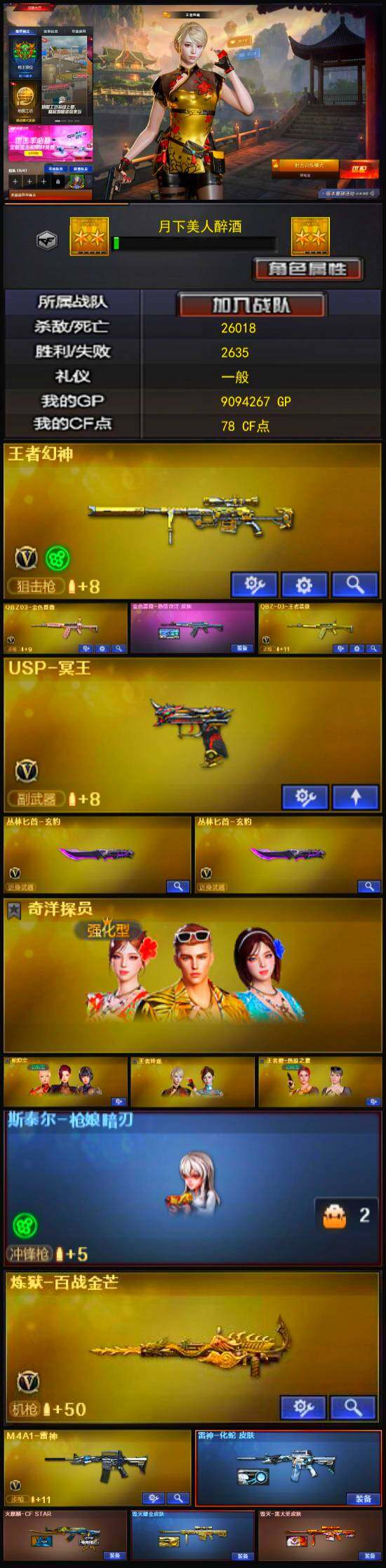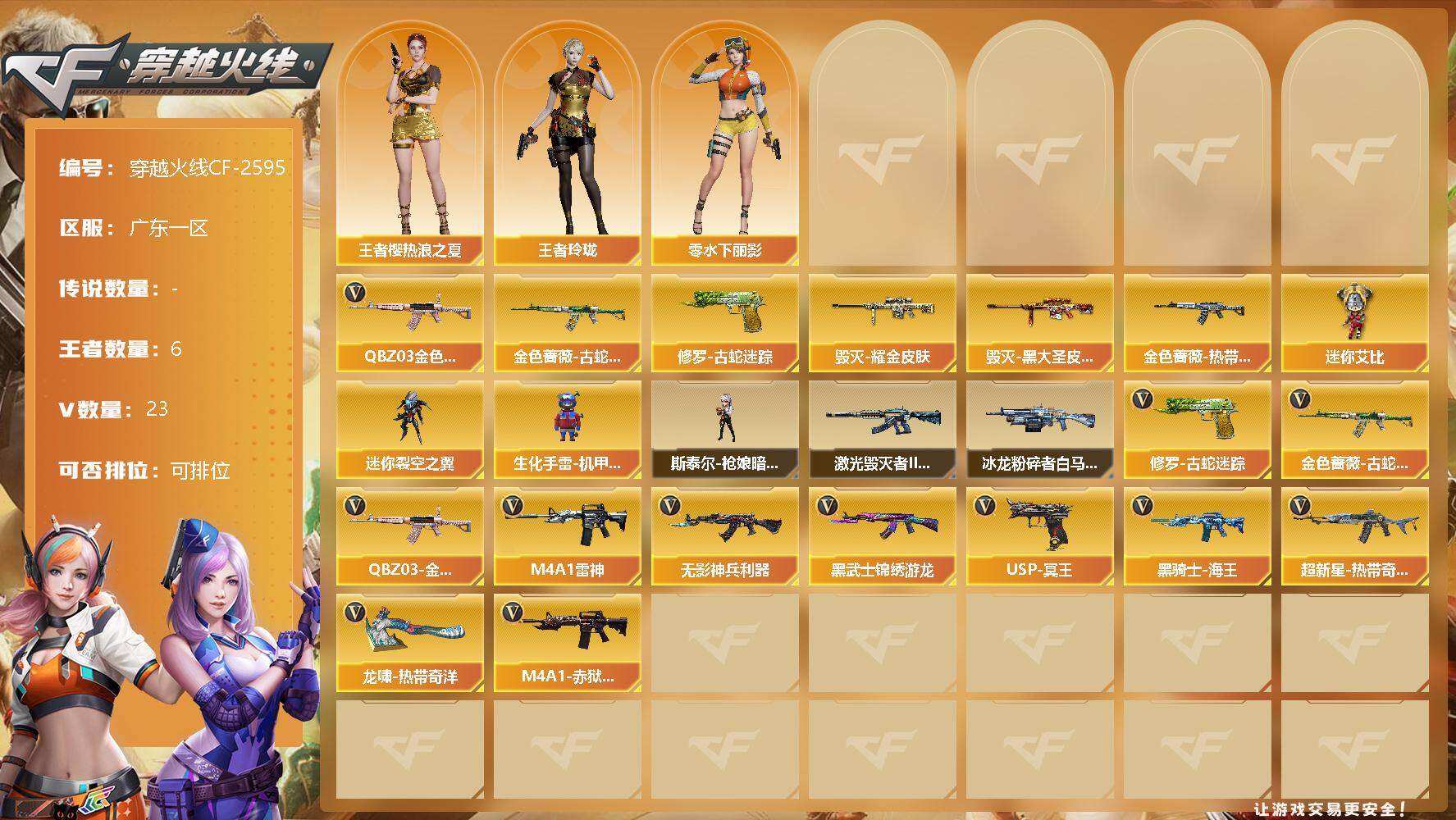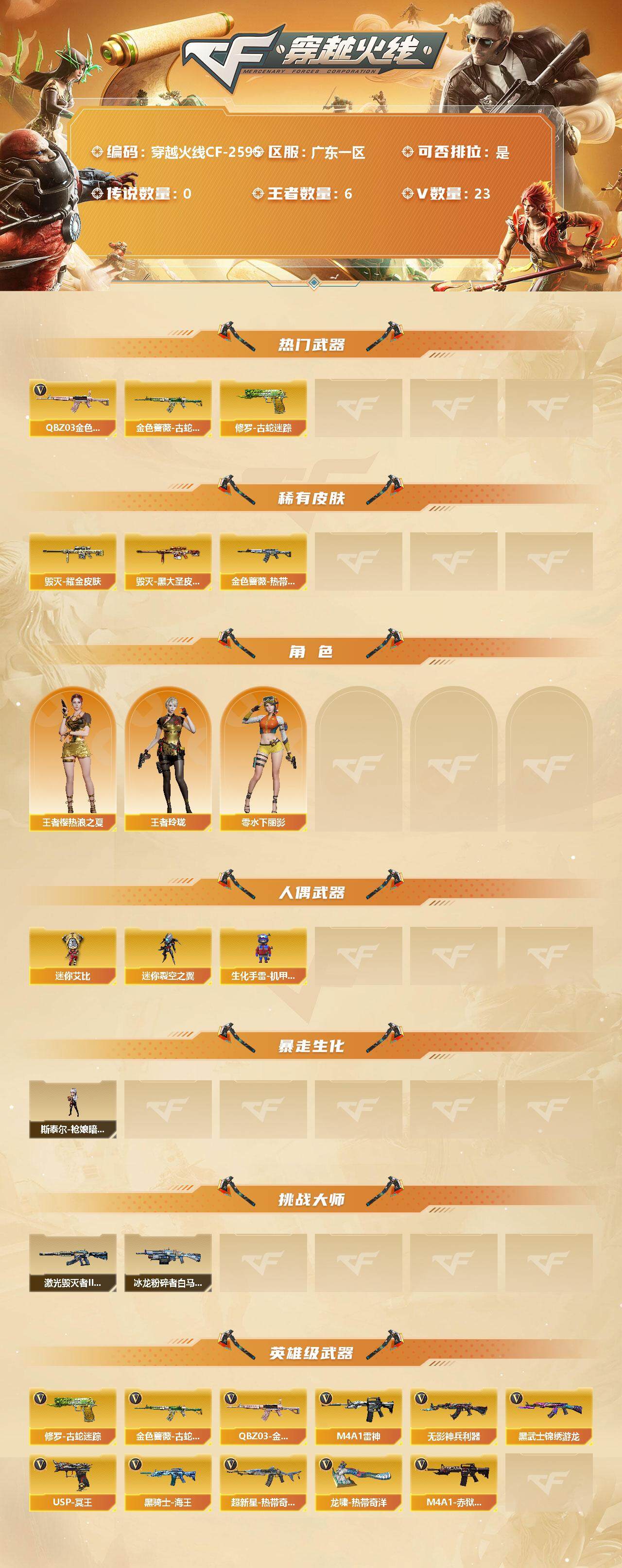 [12238703]【商品标题】:广东一区-23V-6王者-0炫金 【热门武器】:QBZ03-金色蔷薇,金色蔷薇-古蛇迷踪,修罗-古蛇迷踪 【稀有皮肤】:金色蔷薇-热带奇洋 皮肤,毁灭耀金皮肤,毁灭-黑大圣皮肤 【角色】:王者樱-热浪之夏,王者玲珑,零-水下丽影 【人偶武器】:迷你艾比,迷你裂空之翼,生化手雷-机甲核心 【暴走生化】:斯泰尔-枪娘暗刃 【挑战大师】:激光毁灭者III-白马银枪,冰龙粉碎者-白马银枪 【英雄级武器】:QBZ03-金色蔷薇,金色蔷薇-古蛇迷踪,无影-神兵利器,M4A1-雷神,黑武士-锦绣游龙,黑骑士-海王,超新星-热带奇洋,M4A1-赤狱骑士,修罗-古蛇迷踪,USP-冥王,龙啸-热带奇洋 【特殊枪械】: