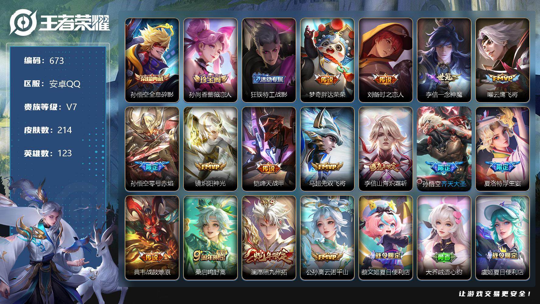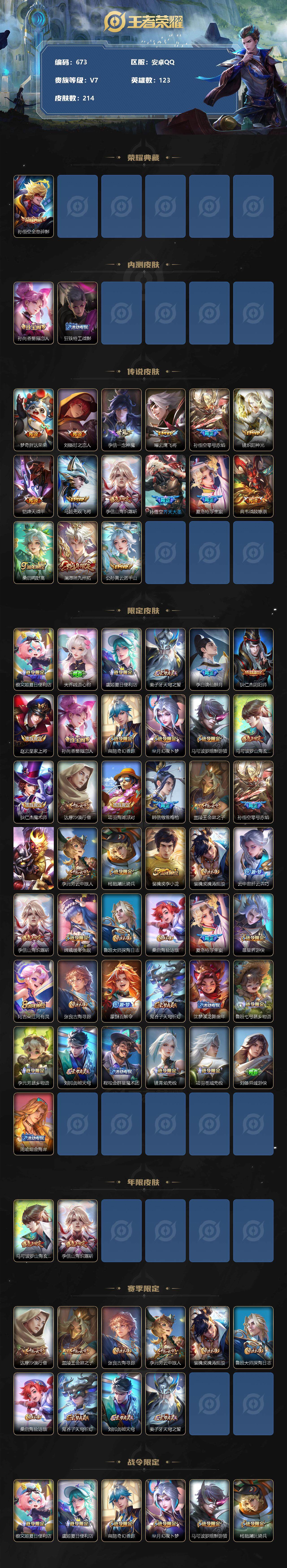 [12239249]【商品标题】:安卓Q-V7-至尊星耀IV段位-123英雄-214皮肤-1典藏-0珍品无双-0无双-0珍品传说-15传说-61史诗