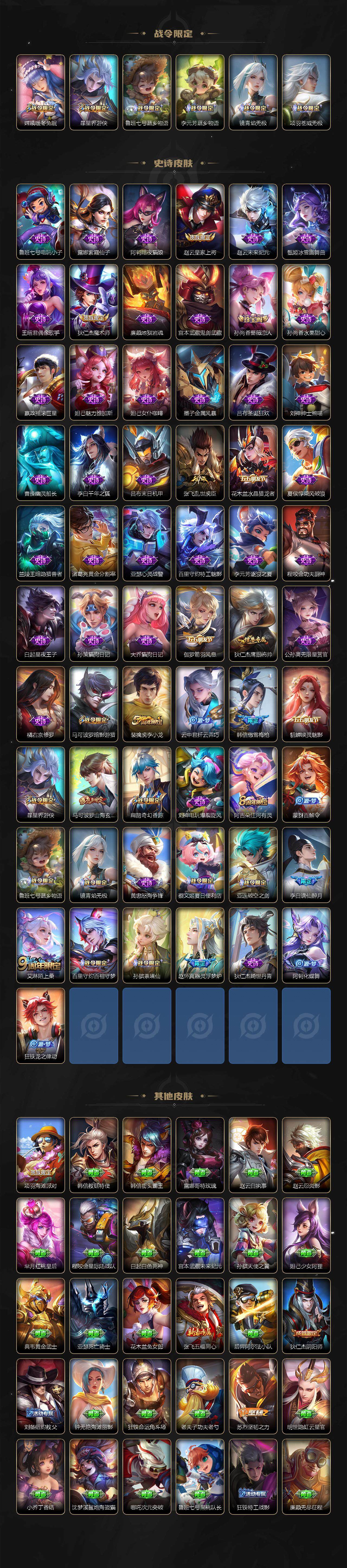 【史诗皮肤】:鲁班七号电玩小子,露娜紫霞仙子,阿轲暗夜猫娘,赵云皇家上将,赵云未来纪元,甄姬冰雪圆舞曲,王昭君偶像歌手,狄仁杰魔术师,廉颇地狱岩魂,宫本武藏鬼剑武藏,孙尚香蔷薇恋人,孙尚香水果甜心,嬴政摇滚巨星,妲己魅力维加斯,妲己女仆咖啡,墨子金属风暴,吕布圣诞狂欢,刘禅绅士熊喵,曹操幽灵船长,李白千年之狐,吕布末日机甲,张飞乱世虎臣,花木兰水晶猎龙者,夏侯惇乘风破浪,兰陵王暗隐猎兽者,诸葛亮黄金分割率,亚瑟心灵战警,百里守约特工魅影,李元芳逐浪之夏,程咬金功夫厨神,白起星夜王子,孙策猫