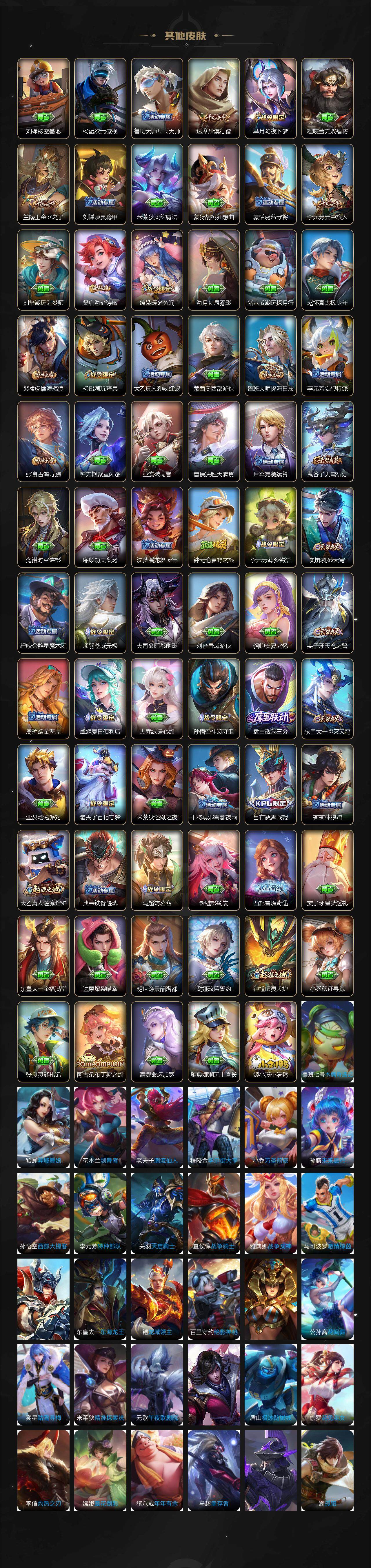 伽罗箭羽风息,李元芳逐浪之夏,公孙离无限星赏官,大乔猫狗日记,孙策猫狗日记,露娜紫霞仙子,诸葛亮黄金分割率,王昭君偶像歌手,阿轲暗夜猫娘,吕布末日机甲,鲁班七号电玩小子,橘右京修罗,嬴政摇滚巨星,刘禅绅士熊喵,白起星夜王子,程咬金功夫厨神,兰陵王暗隐猎兽者,曹操幽灵船长,宫本武藏鬼剑武藏,亚瑟心灵战警,廉颇地狱岩魂,夏侯惇乘风破浪,花木兰水晶猎龙者,墨子金属风暴,吕布圣诞狂欢,百里守约特工魅影,李白千年之狐,貂蝉唤灵魅影,刘禅电玩·爆裂旋风,蒙犽百解令,李白谪仙醉月,赵怀真器灵·浮梦炉,狄仁杰绮世丹青