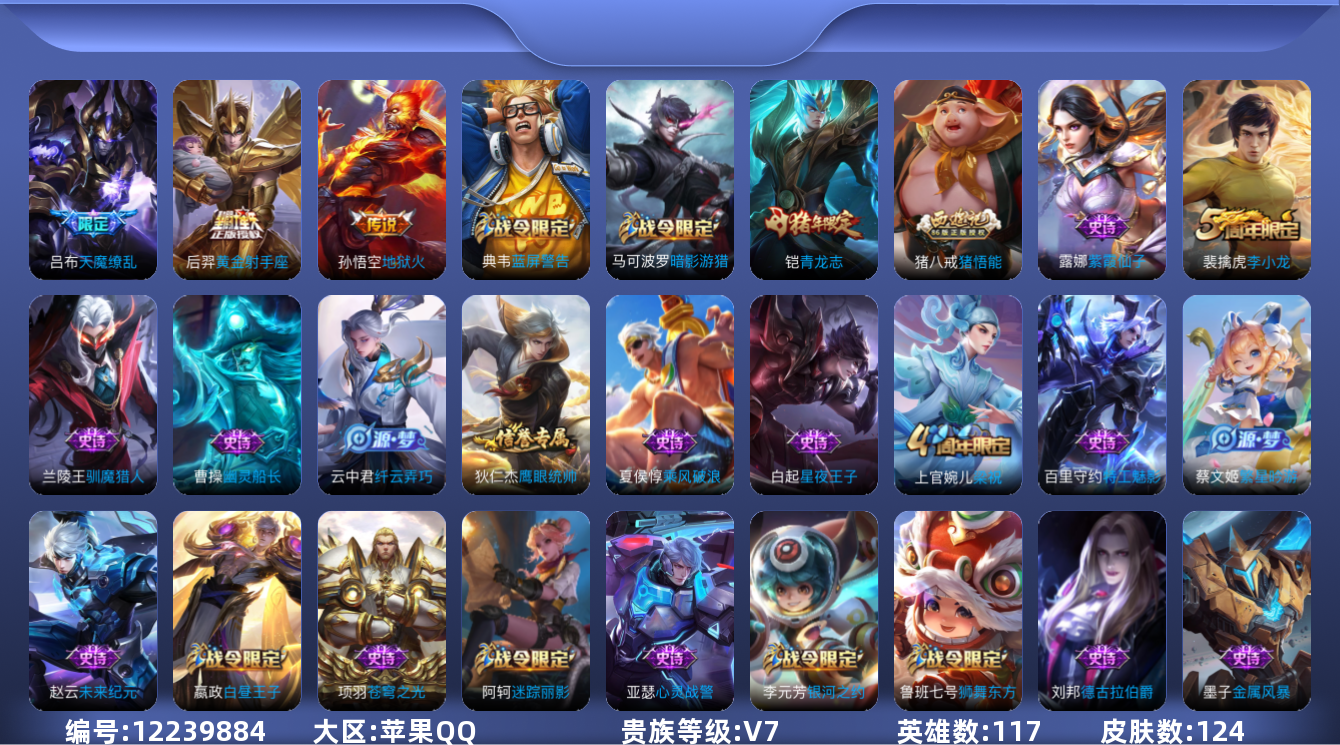 [12239884]V7 3传说 117英雄 124皮肤 可修改实名 女号 优质装备:黄金射手座,地狱火 限定皮:青龙志(铠年限),梁祝,李小龙,猪悟能,天魔缭乱 史诗皮:紫霞仙子,苍穹之光,特工魅影,绅士熊喵,天才门将,星夜王子,德古拉伯爵,幽灵船长,心灵战警,地狱岩魂,纤云弄巧,繁星吟游(呼啦呼啦),乘风破浪,金属风暴,圣诞恋歌,鹰眼统帅,王者之锤,未来纪元-赵云
