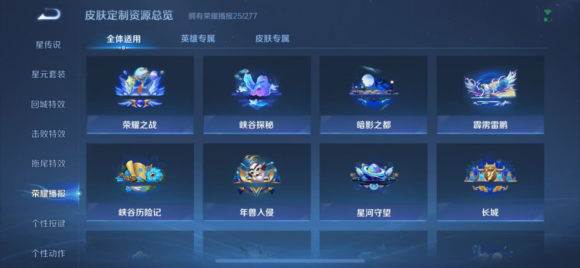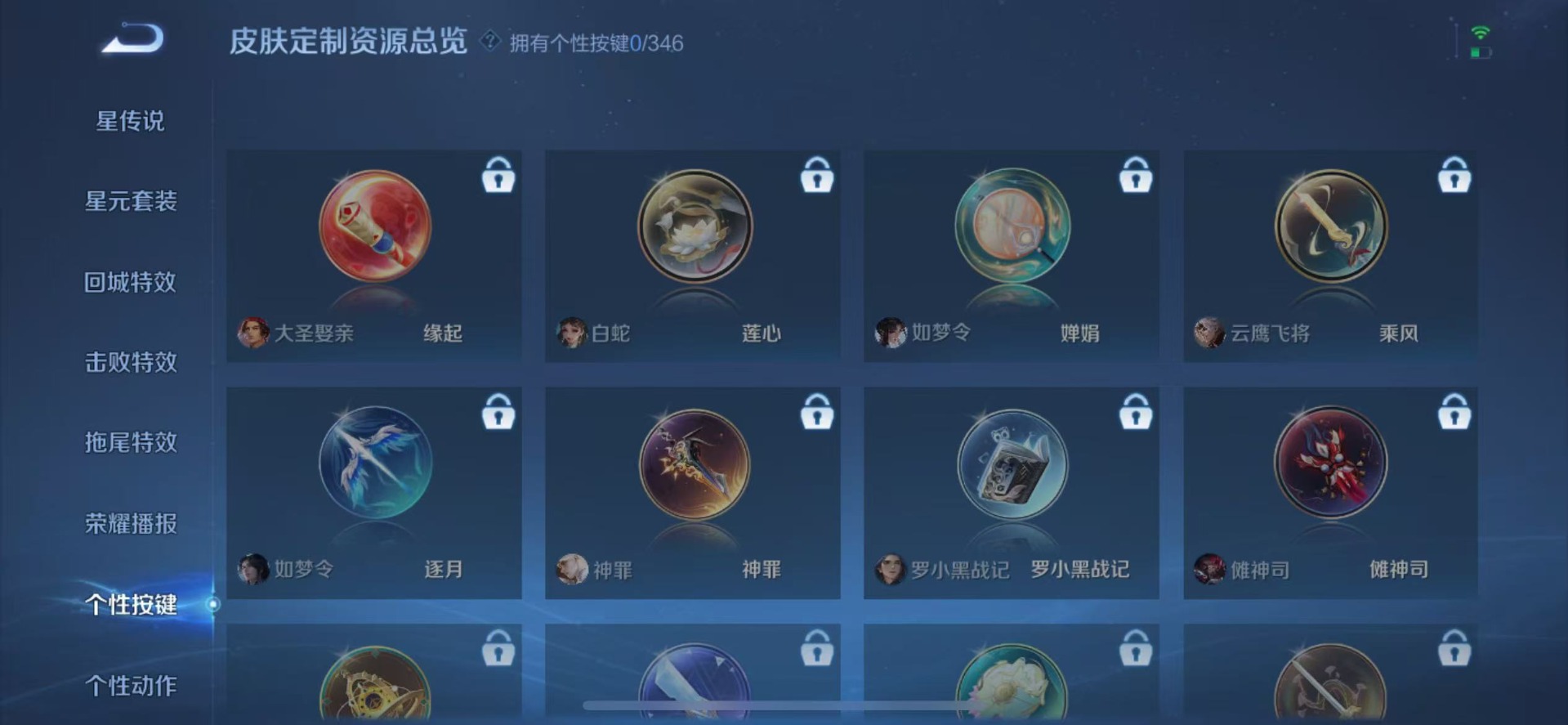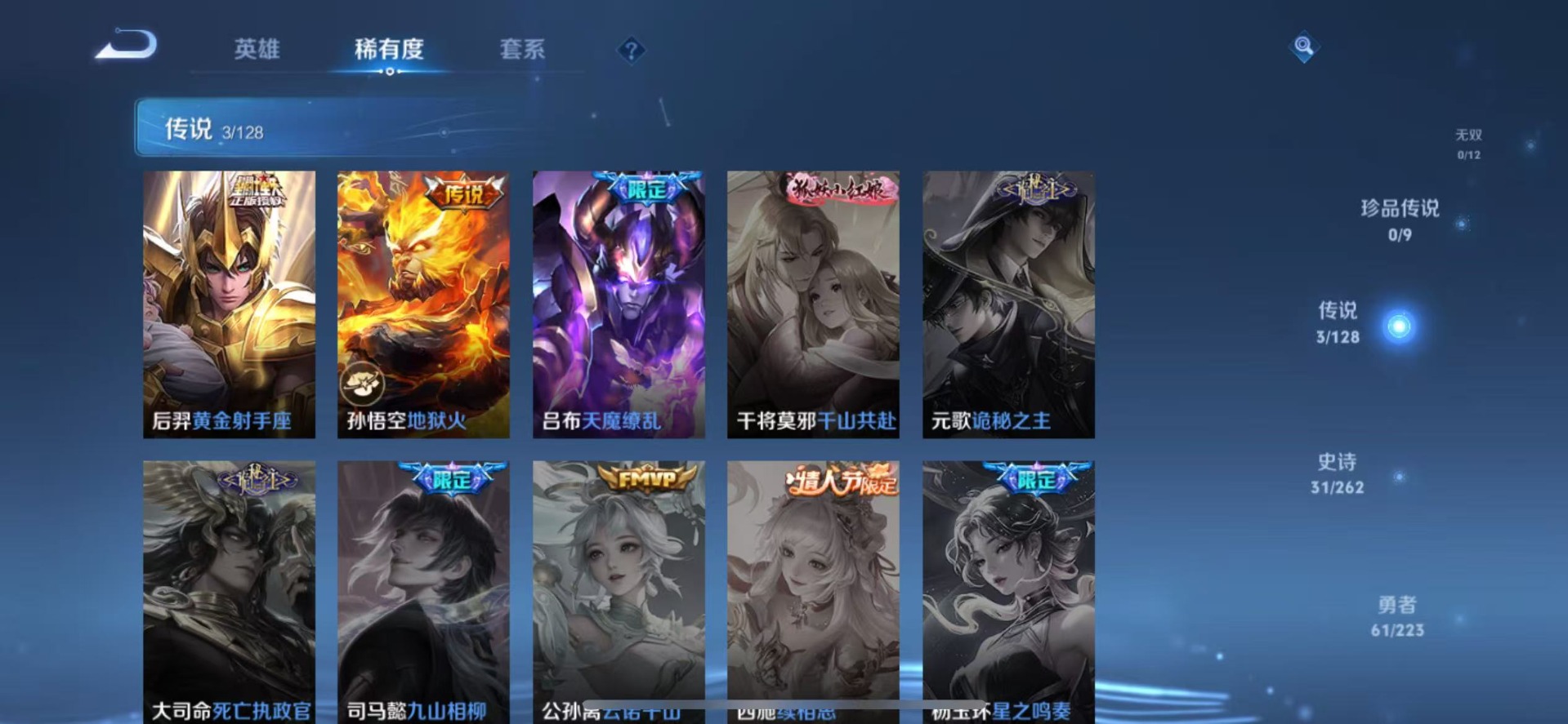 兰陵王金庭之子,刘邦夺宝奇兵,夏侯惇朔风刀,鲁班大师探海日志,老夫子醍醐杖,沈梦溪星空之诺,明世隐疑决卦,盾山御銮,马可波罗暗影游猎,曹操烛龙,鬼谷子原初探秘者,女娲朔望之晖,苏烈千军破阵,狄仁杰万华元夜,嬴政白昼王子,典韦穷奇,典韦蓝屏警告,芈月重明,程咬金演武夺筹,达摩沙漠行僧,牛魔御旌,李元芳银河之约,鲁班七号狮舞东方,吕布猎兽之王,弈星混沌棋,米莱狄御霄,钟馗神迹守卫,钟馗驱傩正仪,狂铁御狮