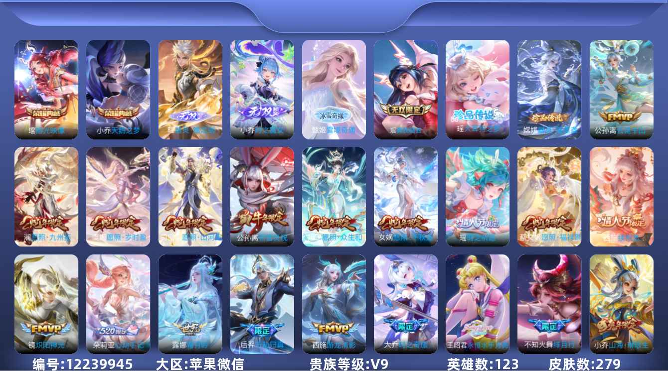[12239945]V9 2典藏 4无双 2珍品传说 34传说 123英雄 279皮肤 小乔小国标 貂蝉小国标 女号 可修改实名 优质装备:天鹅之梦(小乔典藏),真我赫兹(瑶)(瑶无双),小乔时之魔女(小乔无双),拾光映像(瑶典藏),雪境奇遇-甄姬,器灵·螭龙剑,器灵·落星盏,大耳狗之梦,猫影幻舞,炽阳神光,仲夏夜之梦(大飞蛾),音你心动-小乔,乞巧织情,游龙清影(小青龙),遇见胡旋,挚爱花嫁,山海·琳琅生(小乔年限),记忆之芯(机甲兔),妄想实况,妄想奇谈,大乔-时之奇旅,永恒水手月亮,霜月吟,朵莉亚心动手记,牧神诗旅,千劫归真 传说皮:貂蝉曦玄引,星之鸣奏,续相思,云诺千山 珍宝阁皮:妄想食味,蔷薇恋人 限定皮:愿照·九州拓(澜年限),愿照·福禄聚(蔡文姬年限),愿照·岁时盈(虞姬年限),愿照·山河定(司空震年限),愿照·众生和(妲己年限),愿照·千秋盛(女娲年限),映山客,鸣野蒿,绯月行,时之彼端,白鹤梁神女,白晶晶,山海·碧波行(瑶年限),至美·乘鲤谣,高山流水,五谷丰年,梁祝,逐梦之音,祈雪灵祝(雪兔子),天狼绘梦者,如梦令-嫦娥,奇迹圣诞,默契交锋-花木兰,蜜橘之夏,寅虎·心曲(虎婆),时之祈愿-瑶(瑶传限),玉兔公主 史诗皮:器灵·浮梦炉,化蝶舞,鸭鸭历险记-刘禅,琥珀纪元伽罗,茶境仙,幻珠鲛人,乘龙·忆丹青(大乔年限),破空之剑,涂山红红,芈月浮光幕影,夜落电台,织梦人,遇见神鹿,紫霞仙子,苍穹之光,白蛇,江河有灵,百解令(蒙犽),高渐离燃音魔法,蒙恬荣光圣徽,晚萤,魅语,无限星赏官,冰冠公主,青蛇,偶像歌手,浮梦罗烟,猫狗日记-大乔,时之恋人-孙尚香,乱世虎臣,节奏热浪,女仆咖啡,摇滚巨星,水果甜心,天才门将,心灵骇客,时之奇旅-安琪拉,暗隐猎兽者,幽灵船长,鬼剑武藏,暗渊魔法,心灵战警,舞动绿茵,地狱岩魂,诗语江南,纤云弄巧,拒霜思,缤纷独角兽,乘风破浪,月团寄思,水晶猎龙者,箭羽风息,唤灵魅影,原初追逐者,圣诞狂欢,圣诞恋歌,鹰眼统帅,