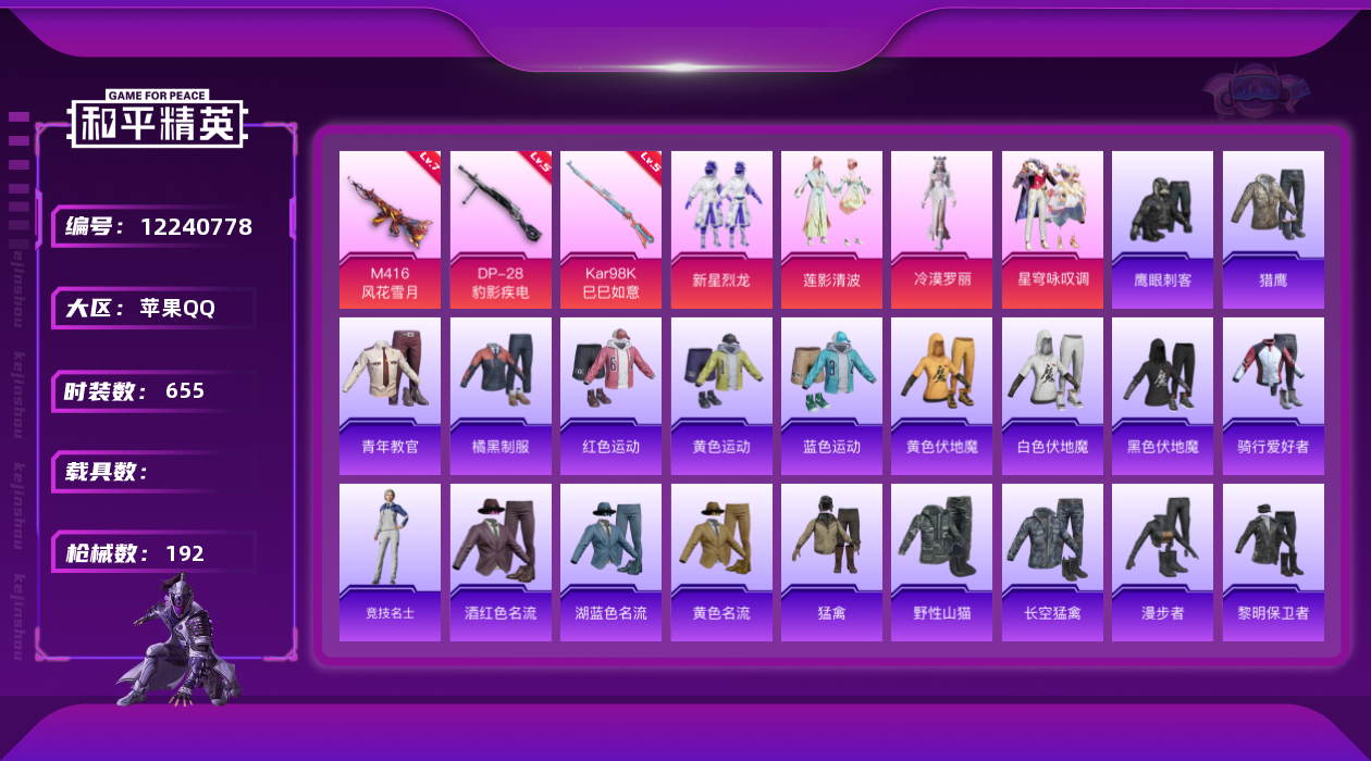 [12240778]4粉装 3特效枪 10印记 可二次 可修改实名 优质装备:新星烈龙(小白龙),M416风花雪月,七级M416-风花雪月,星穹咏叹调,冷漠罗丽,Kar98K-巳巳如意 热门装扮:莲影清波,鹰眼刺客 稀有枪皮:DP-28-豹影疾电 五级特效枪:五级Kar98K-巳巳如意,五级DP-28-豹影疾电 紫色装扮:极速光影,SS31特训套装,云朵鹅,彩虹兔,雪绒豹,SS33特训套装,顶瓜瓜,SS23特训,田园牧歌,轻风白浪,SS22特训,夏日音浪,千禧之恋,吉莉礼服,完美偶像,帅气教官,幻世战舞者,幻影武者,战地督导,冷焰舞者,人气偶像,冰川特警,娇憨猪猪,SS16特训,冰爽风暴,瑞龙福将,团圆交子,SS17特训,萌趣颜团子,特种颜团子,SS15特训,暗夜傀儡,SS21特训,SS20特训,战地菁英,萌趣咩咩,竞技角斗士,雪兔飞飞,异彩先驱,缤纷焰火,SS18特训,飞驰魅影,音速流光,SS19特训,龙的传人,骑行爱好者,魅力单车,鹤鸣,麻辣教官,黄色伏地魔,黄色名流,黄色运动,黎明保卫者,黑色伏地魔,龙腾端午,风暴特警,龟仙人,都市魅力,酒红色名流,酷潮明星,野性山猫,野性战心,长空猛禽,雨林探路者,雪山征服者,霓虹极客,霓虹街区,青年教官,绛羽幽主,探宝勇士,炫蓝之夏,清新柠檬,湖蓝色名流,滨海假日,滨海厨神,灰色格斗者,灼焰舞者,热血青春,牛气冲天,牛气满满,特战英豪,深蓝色名流,极地朋克,极速红龙,柠萌假日,橘黑制服,沙漠兵团,沙漠毒蛇,派对绅士,绮丽涂鸦,缤纷果语,耀眼新星,红色运动,蓝彩潮人,蓝色运动,虎虎生威吉莉,街头潮人,超能勇士,白色伏地魔,猎鹰,猛禽,王牌教练,甜蜜告白,甜蜜熊情侣,甜蜜菠萝,破晓战魂,破蛋小黄鸡,福星高照,空投萌叽,竞技达人朋克,SS29特训,SS28特训,玉兔迎春,燕燕于飞,巳巳如意,智谋强哥,鱼渊荷华,竞技名士,惊鸿侠骨,SS24特训(SS24特训套装),SS25特训,元气发射,锦衣飞扬,金羽特工,焰鹰斗篷,幻羽潜行,幽夜迷踪,SS27特训,湖雨初晴,冰公主,晨曦薄雾,SS26特训,春光漫游,快闪甜心,白糯汤圆,精神漫游,SS8特训,SS12特训,SS11特训,耀粉歌者,大橘大利,星渊小夜曲,星影赞美诗,绯格组合,春日漫步,猎影月神,青玉碎影,萌黄之夏,SS32特训服(SS32特训套装),紫幽梦,蓝冰羽,恋语绒绒,粉恋花,光之冒险,漫步者