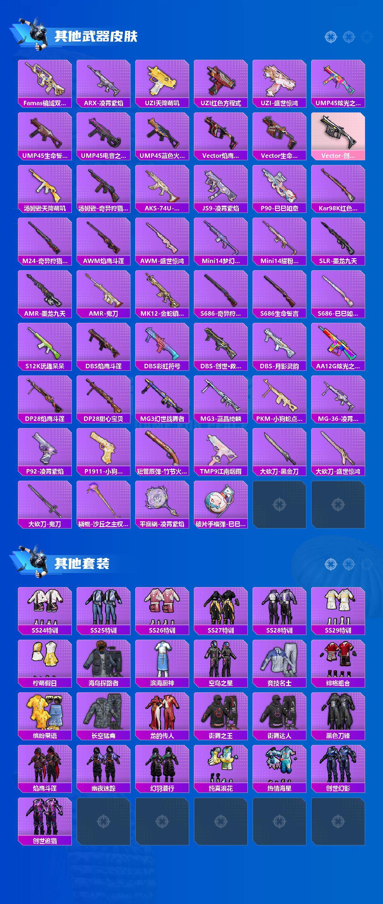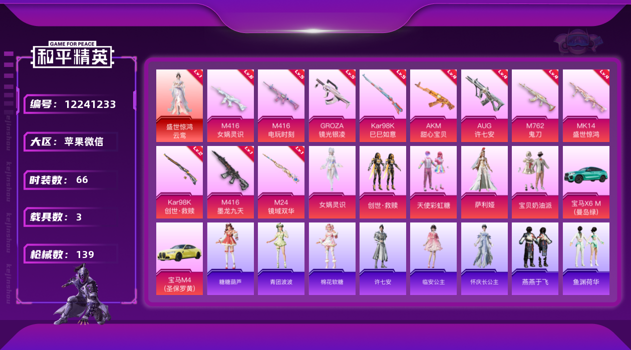 [12241233]身法素材号【特价急出/详情看图】:苹果 微信-1神装-6粉装-12特效枪-2载具-8粉色飞行器-50685热力值-3王牌印记-66套装-139枪皮 【红色神装等级】:盛世惊鸿-云鸾(一级) 【红色角色神装】:盛世惊鸿-云鸾 【热门品类】:粉装-梦幻火箭 【粉色载具】:宝马M4(圣保罗黄),宝马X6 M(曼岛绿),僚机-萌兔起飞 【粉色套装】:粉装-宝贝奶油派,粉装-天使彩虹糖,粉装-梦幻火箭,套装-创世·救赎,角色-萨利娅,角色-女娲灵识 【粉色枪皮等级】:AKM-甜心宝贝(四级),M416-电玩时刻(五级),M416-墨龙九天(一级),M416-女娲灵识(六级),GROZA-镜光银凌(五级),AUG-许七安(四级),M762-鬼刀(四级),Kar98K-创世·救赎(二级),Kar98K-巳巳如意(五级),M24-镜域双华(一级),Mk14-盛世惊鸿(四级),DP-28-豹影疾电(五级) 【粉色枪皮】:AKM-甜心宝贝,M416-电玩时刻,M416-墨龙九天,M416-女娲灵识,GROZA-镜光银凌,AUG-许七安,M762-鬼刀,Kar98K-创世·救赎,Kar98K-巳巳如意,M24-镜域双华,Mk14-盛世惊鸿,DP-28-豹影疾电 【粉色飞行器】:酣梦熊熊飞行器,梦幻火箭飞行器,沙丘之主天马,镜域双华-灵镜之阶,龙翔九天飞行器,凤舞九天飞行器,万象金身飞行器 【粉色降落伞】:甜心宝贝降落伞,梦幻火箭降落伞,风花雪月降落伞,萌酷奶龙降落伞,墨龙九天降落伞,创世·救赎降落伞,临安公主降落伞,盛世惊鸿降落伞,金蛇镇世降落伞,鬼刀降落伞,雪月幻音降落伞 【稀有套装】:套装-糖糖葫芦,套装-青团波波,套装-棉花软糖,角色-许七安,角色-临安公主,角色-怀庆长公主,套装-燕燕于飞,套装-鱼渊荷华,角色-风玲,角色-海琴烟,套装-星影赞美诗,套装-极速光影,套装-朱霞炽焰,套装-凌霄紫焰,套装-擎苍青焰 【稀有枪皮】:AKM-破晓战魂,AKM-龙的传人,AKM-玄冥寒域,M16A4-快乐主宰,SCAR-L-红色方程式,SCAR-L-小狗蛇点点,M416-红色方程式,M416-蓝色火焰,M762-奇异狩猎者,M762-甜心宝贝,Mk47-炫光之旅,蜜獾-天降萌叽,Famas-镜域双华,ARX-凌霄紫焰,UZI-天降萌叽,UZI-红色方程式,UZI-盛世惊鸿,UMP45-