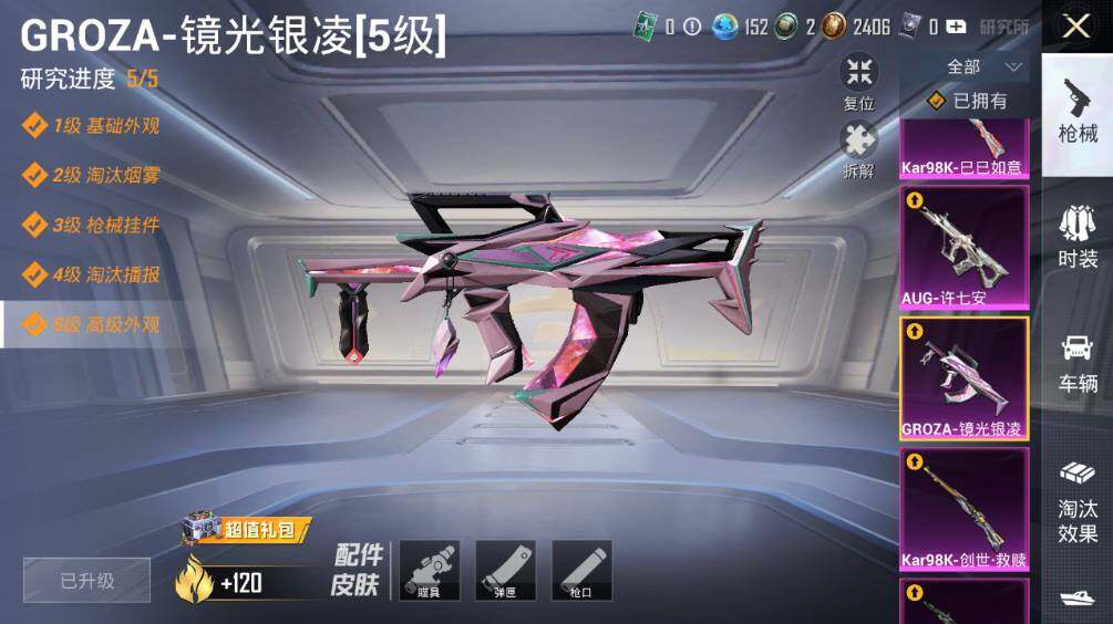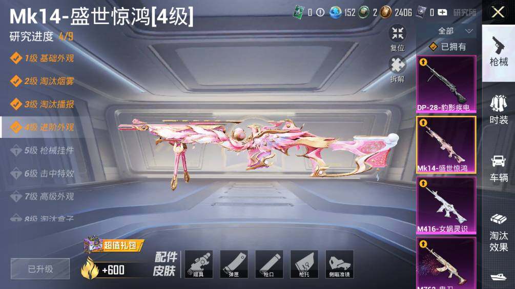 【粉色枪皮等级】:AKM-甜心宝贝(四级),M416-电玩时刻(五级),M416-墨龙九天(一级),M416-女娲灵识(六级),GROZA-镜光银凌(五级),AUG-许七安(四级),M762-鬼刀(四级),Kar98K-创世·救赎(二级),Kar98K-巳巳如意(五级),M24-镜域双华(一级),Mk14-盛世惊鸿(四级),DP-28-豹影疾电(五级)