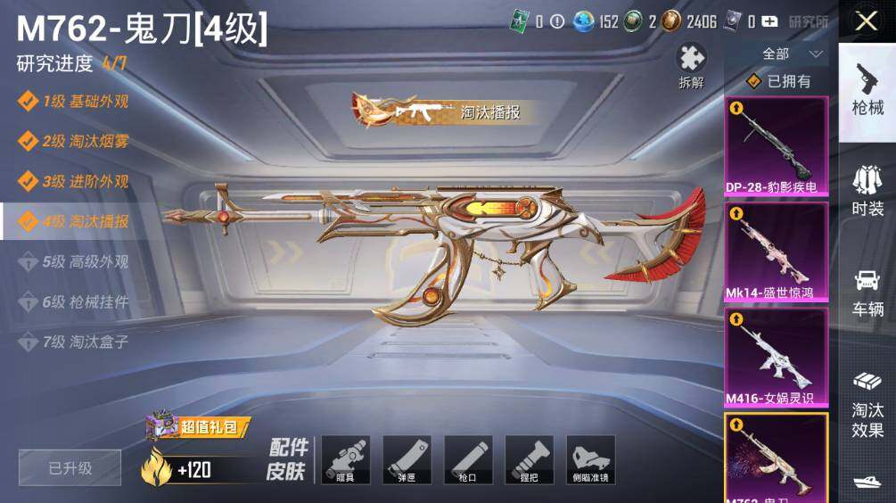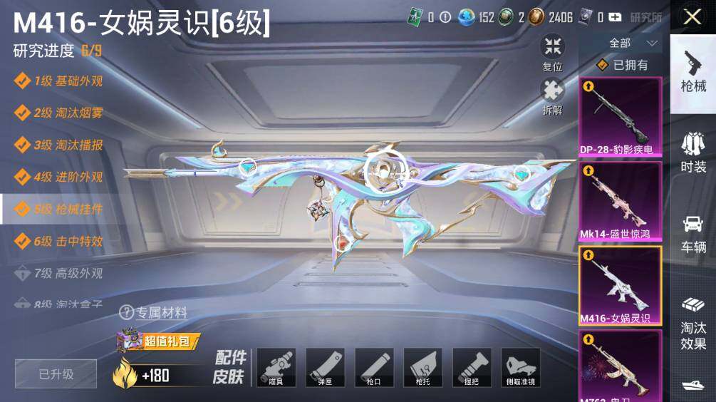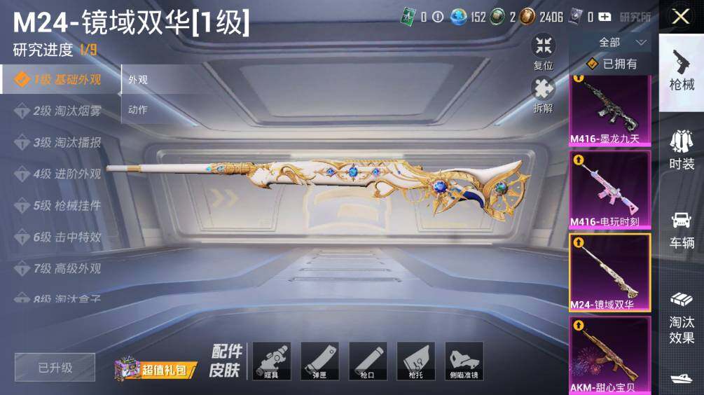 AKM-甜心宝贝,M416-电玩时刻,M416-墨龙九天,M416-女娲灵识,GROZA-镜光银凌,AUG-许七安,M762-鬼刀,Kar98K-创世·救赎,Kar98K-巳巳如意,M24-镜域双华,Mk14-盛世惊鸿