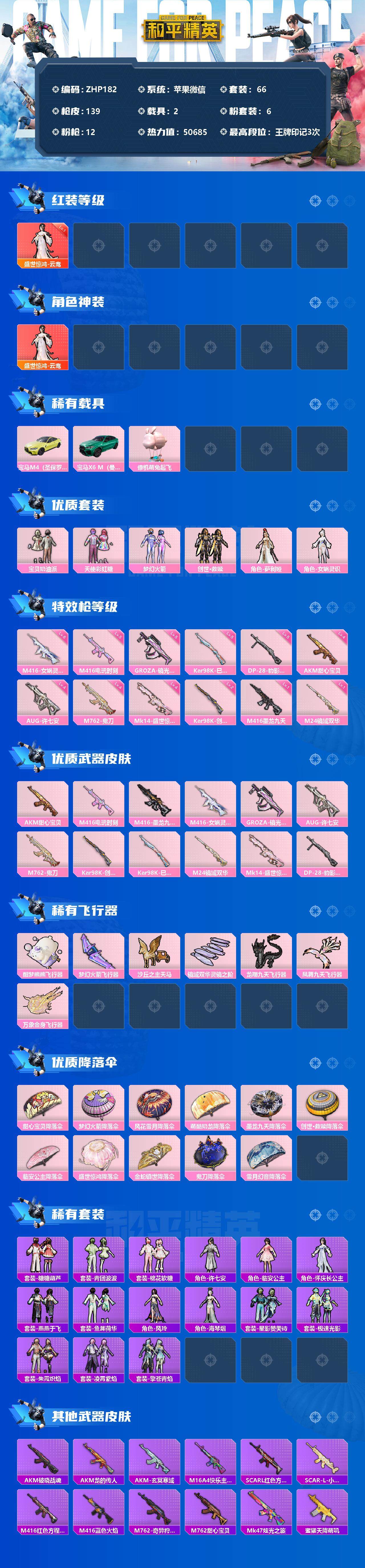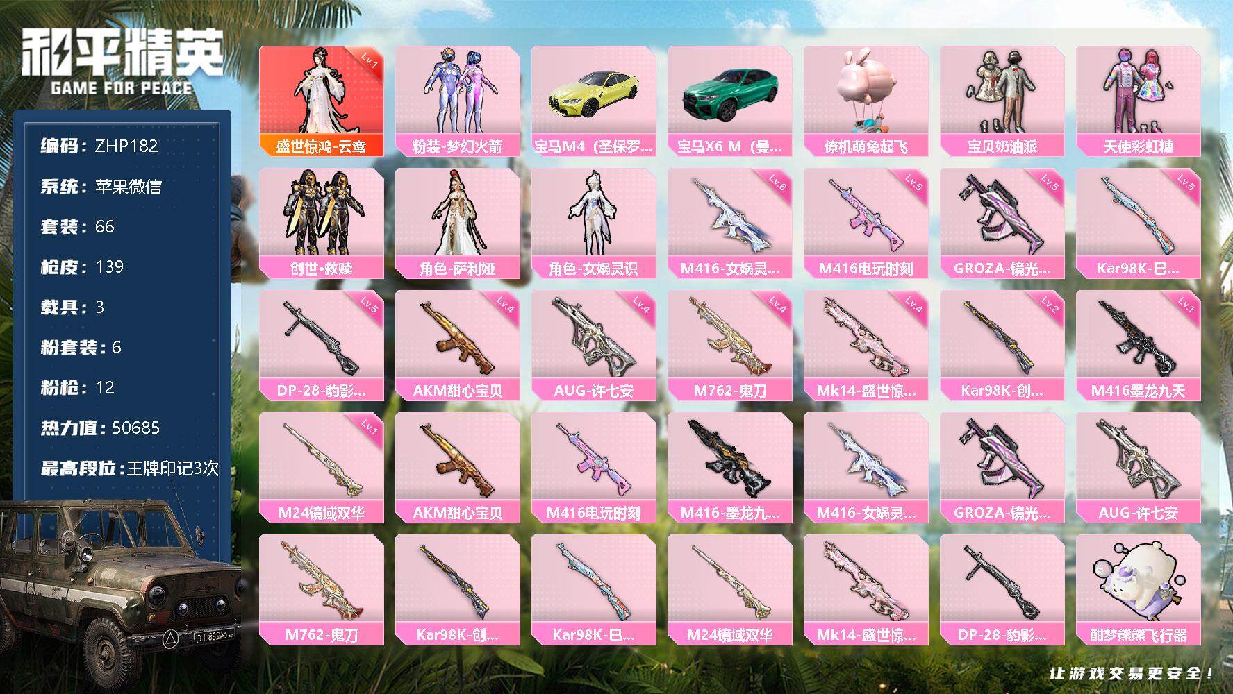 [12241233]身法素材号【特价急出/详情看图】:苹果 微信-1神装-6粉装-12特效枪-2载具-8粉色飞行器-50685热力值-3王牌印记-66套装-139枪皮