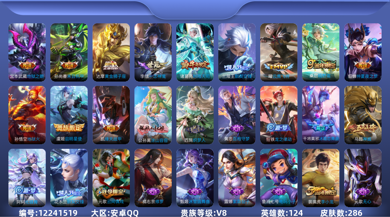 [12241519]V8 12传说 124英雄 286皮肤 可修改实名 女号 优质装备:黄金狮子座,云鹰飞将(小将军),绛天战甲(鸡嘴战神),一念神魔,末日机甲-孙尚香(绿蚂蚱),地狱火,仲夏夜之梦(大飞蛾),地狱之眼,涂山容容 珍宝阁皮:万物之道,蔷薇恋人,玩趣恶龙 限定皮:逐霄战戟,鸣野蒿,时雨天司(水龙头),神威(电光马子),高山流水,五谷丰年,游园惊梦,梁祝,李小龙,默契交锋-兰陵王,默契交锋-花木兰,冰霜恋舞曲 史诗皮:化蝶舞,星界战将,龙之律动,百相守梦-黄忠,织梦人,紫霞仙子,电玩小子(小书包),黄金分割率,特工魅影,千年之狐,江河有灵,蒙恬荣光圣徽,偶像歌手,白蛇,电玩·爆裂旋风,龙骑士(小龙虾),末日机甲-吕布,猫狗日记-孙策,猫狗日记-大乔,时之恋人-孙尚香,乱世虎臣,节奏热浪,修罗,女仆咖啡,摇滚巨星,水果甜心,绅士熊喵,天才门将,星夜王子,心灵骇客,功夫厨神,德古拉伯爵,暗隐猎兽者,幽灵船长,鬼剑武藏,心灵战警,纤云弄巧,拒霜思,乘风破浪,逐浪之夏,水晶猎龙者,曙光守护者,热力回旋,金属风暴,圣诞狂欢,圣诞恋歌,鹰眼统帅,魅力维加斯,无心,未来纪元-赵云