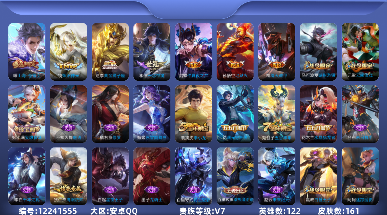 [12241555]【商品标题】:安卓Q-V7-至尊星耀V段位-122英雄-161皮肤-0典藏-0珍品无双-0无双-0珍品传说-7传说-28史诗