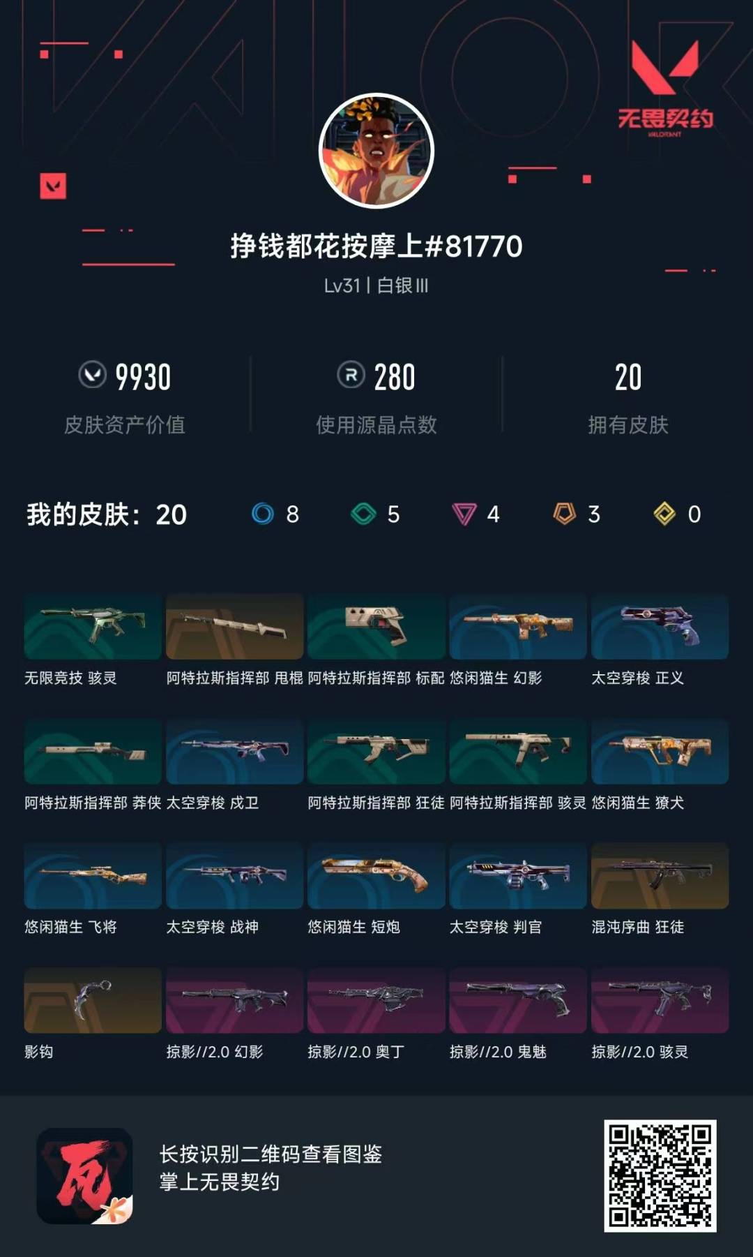 [12242015]3橙皮 4紫皮 20皮肤 12英雄 31卡面 280已用源晶 白银 优质装备:狂徒-混沌序曲,阿特拉斯指挥部,影钩 套装:掠影2.0套装 佩枪皮肤:鬼魅-掠影2.0 冲锋枪皮肤:骇灵-掠影2.0 步枪皮肤:幻影-掠影2.0 机枪皮肤:奥丁-掠影2.0