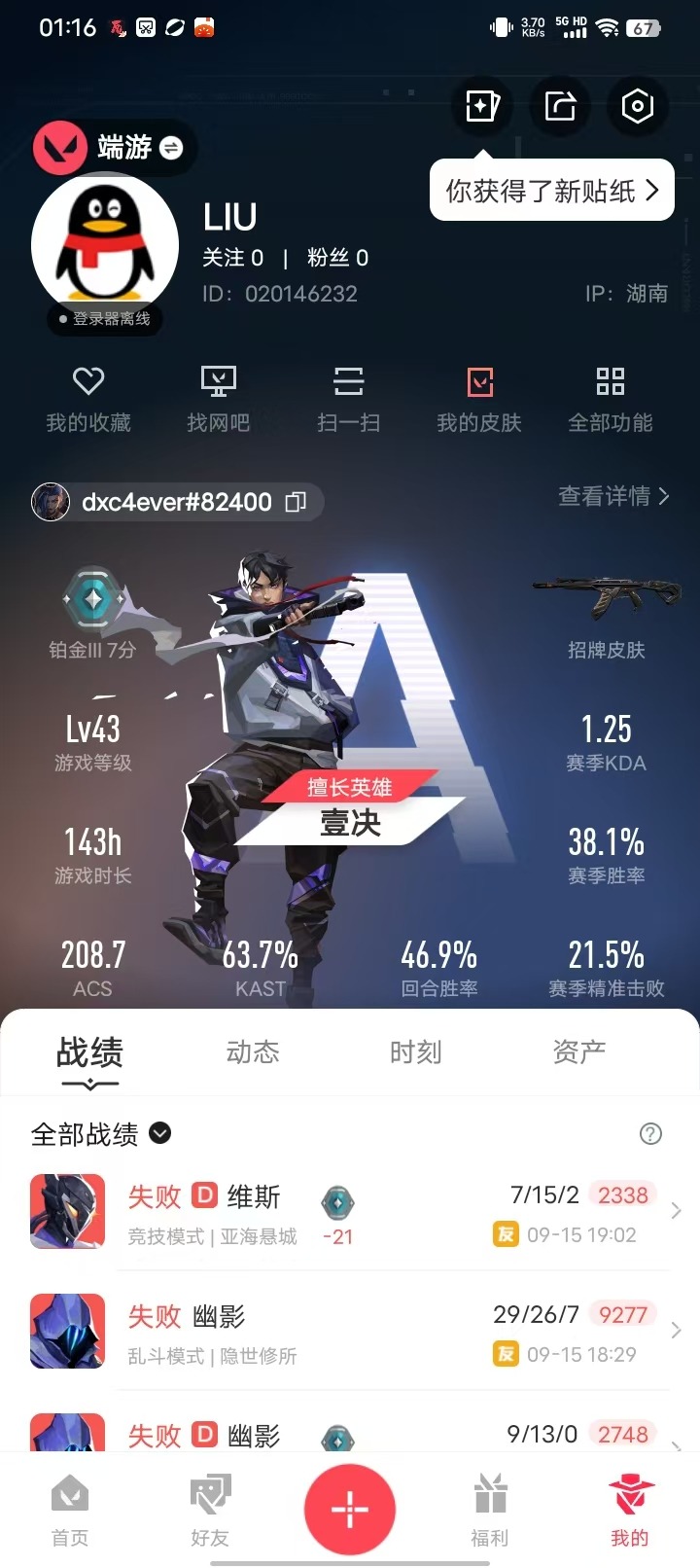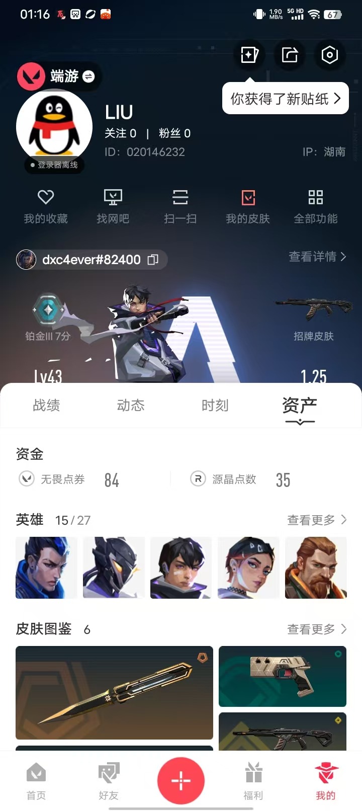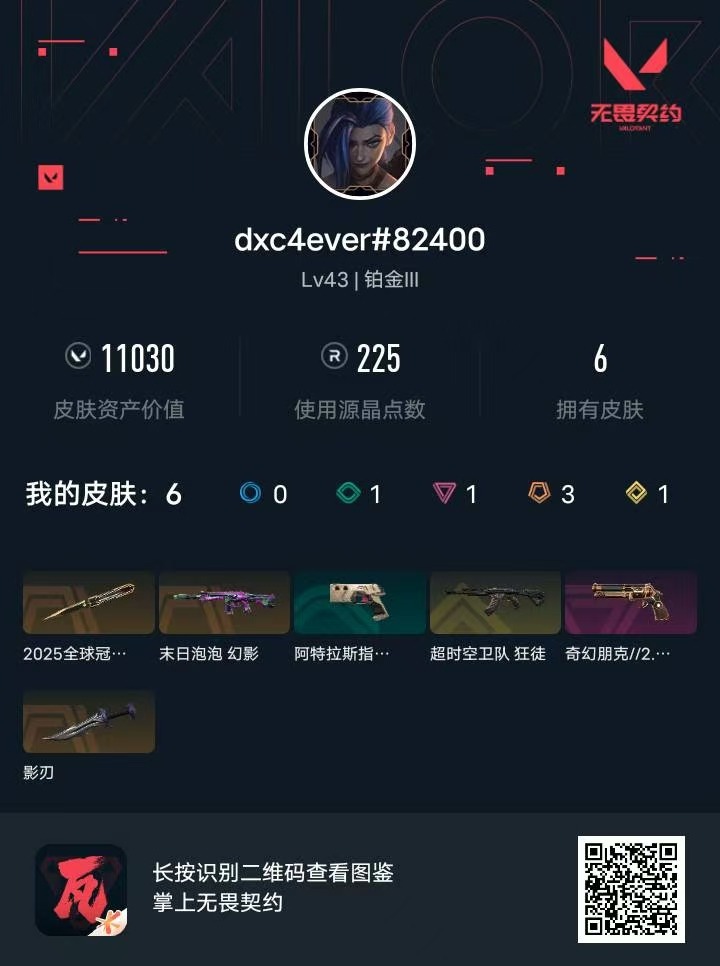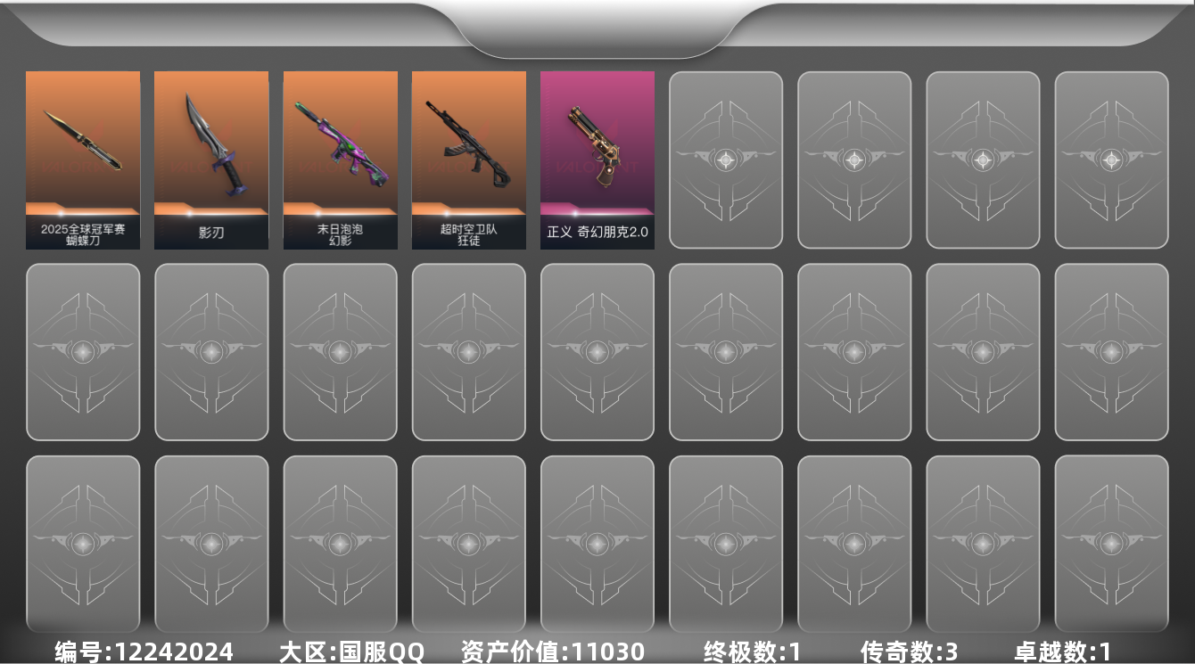 [12242024]3橙皮 1金皮 1紫皮 6皮肤 15英雄 26卡面 225已用源晶 铂金 优质装备:2025全球冠军赛 蝴蝶刀,影刃,幻影-末日泡泡 佩枪皮肤:正义-奇幻朋克2.0 步枪皮肤:狂徒-超时空卫队