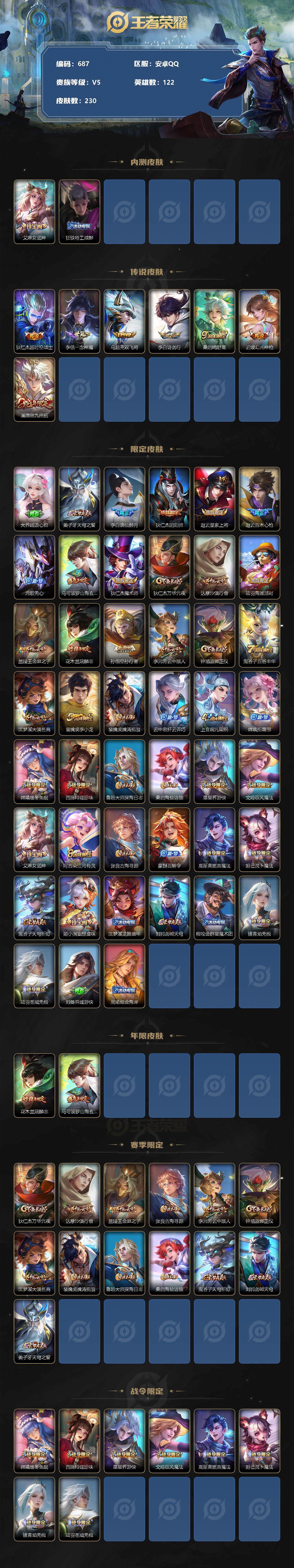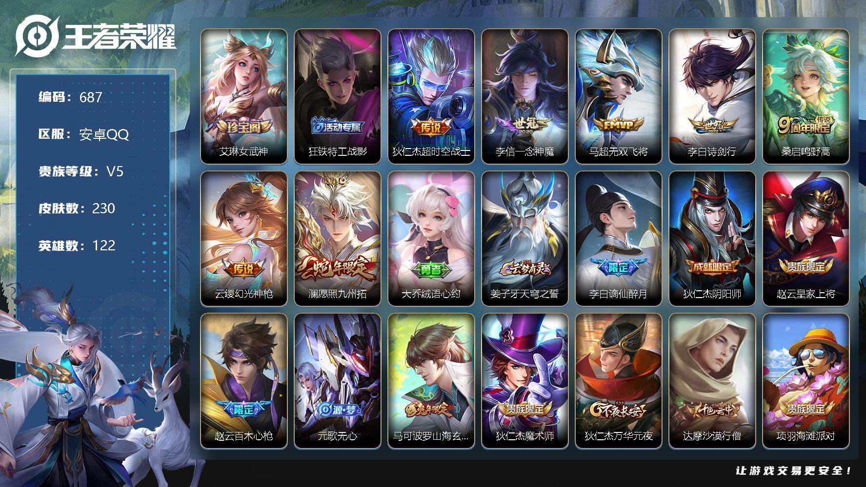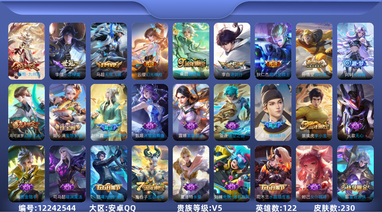 [12242544]【商品标题】:安卓Q-V5-至尊星耀V段位-122英雄-230皮肤-0典藏-0珍品无双-0无双-0珍品传说-7传说-56史诗