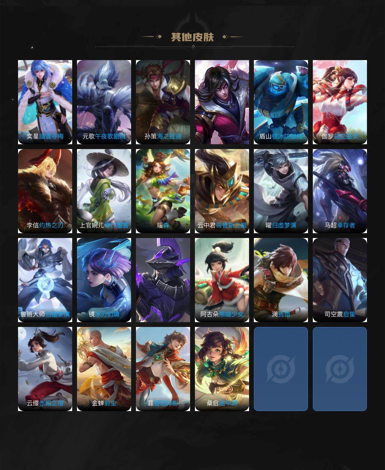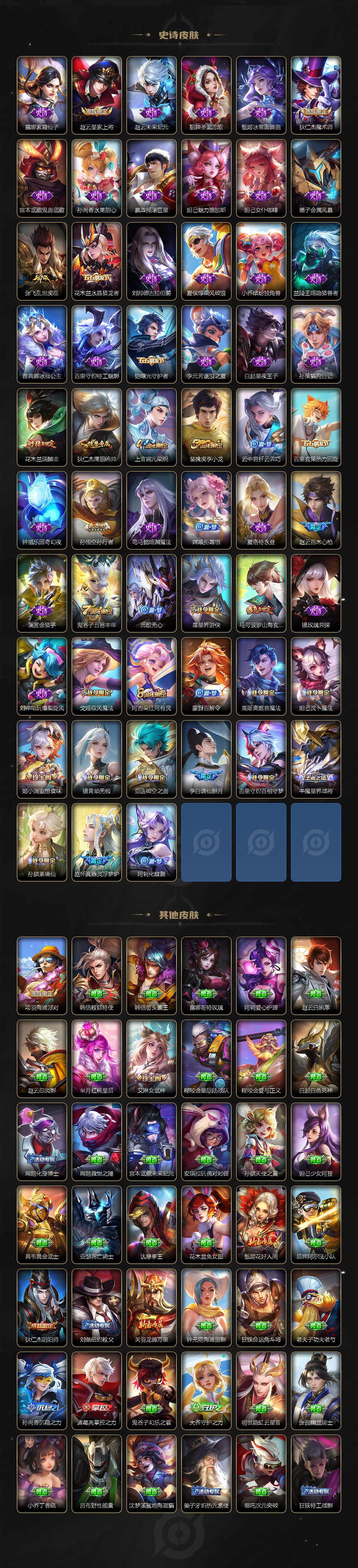 【史诗皮肤】:露娜紫霞仙子,赵云皇家上将,赵云未来纪元,貂蝉圣诞恋歌,甄姬冰雪圆舞曲,狄仁杰魔术师,宫本武藏鬼剑武藏,孙尚香水果甜心,嬴政摇滚巨星,妲己魅力维加斯,妲己女仆咖啡,墨子金属风暴,张飞乱世虎臣,花木兰水晶猎龙者,刘邦德古拉伯爵,夏侯惇乘风破浪,小乔缤纷独角兽,兰陵王暗隐猎兽者,雅典娜冰冠公主,百里守约特工魅影,铠曙光守护者,李元芳逐浪之夏,白起星夜王子,孙策猫狗日记,花木兰瑞麟志,狄仁杰鹰眼统帅,上官婉儿梁祝,裴擒虎李小龙,云中君纤云弄巧,百里玄策热力回旋,钟馗乐园奇幻夜,孙悟空孙行者,司马懿暗渊魔法,嫦娥拒霜思,夏洛特永昼,赵云百木心枪,澜赏金猎手,鬼谷子五谷丰年,元歌无心,暃星界游侠,马可波罗山海玄木吟,镜玫瑰异探,刘禅电玩爆裂旋风,戈娅驭