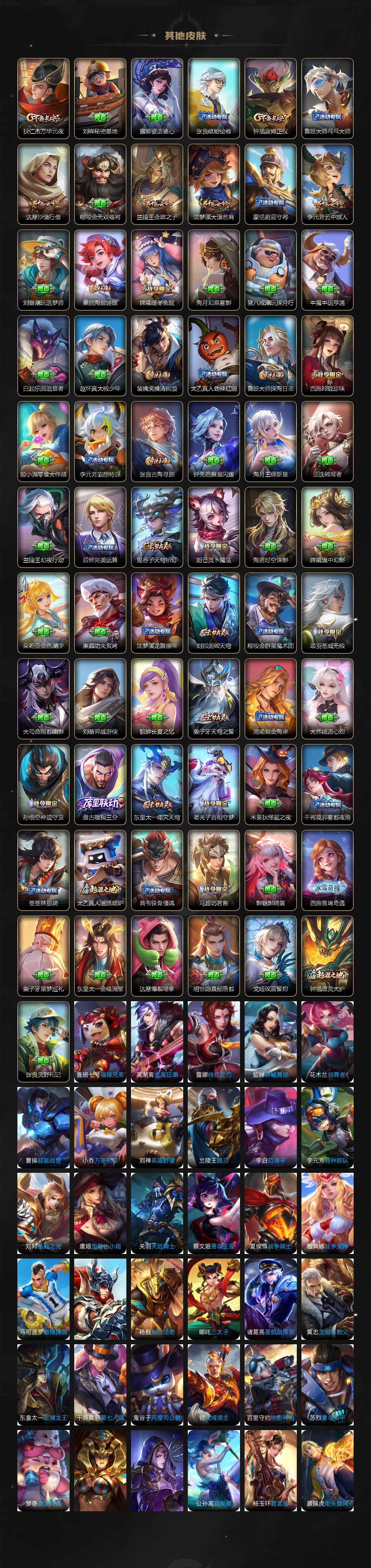【限定皮肤】:大乔绒语心约,姜子牙天穹之誓,李白谪仙醉月,狄仁杰阴阳师,赵云皇家上将,赵云百木心枪,元歌无心,马可波罗山海玄木吟,狄仁杰魔术师,狄仁杰万华元夜,达摩沙漠行僧,项羽海滩派对,兰陵王金庭之子,花木兰瑞麟志,孙悟空孙行者,李元芳云中旅人,钟馗驱傩正仪,鬼谷子五谷丰年,沈梦溪大漠名商,裴擒虎李小龙,裴擒虎擒涛扼浪,云中君纤云弄巧,上官婉儿梁祝,嫦娥拒霜思,嫦娥暖冬兔眠,西施玲珑珍味,鲁班大师探海日志,桑启海盐诗旅,暃星界游侠,戈娅驭风魔法,艾琳女武神,阿古朵江河有灵,张良古海寻踪,蒙犽百解令,高渐离燃音魔法,妲己灵卜魔法,鬼谷子天穹祈灯,姬小满妄想食味,沈梦溪龙舞盛年,刘邦剑破天穹,程咬金群星魔术团,镜青焰无极,项羽苍威无极,刘备异域游侠,周瑜熔金海岸