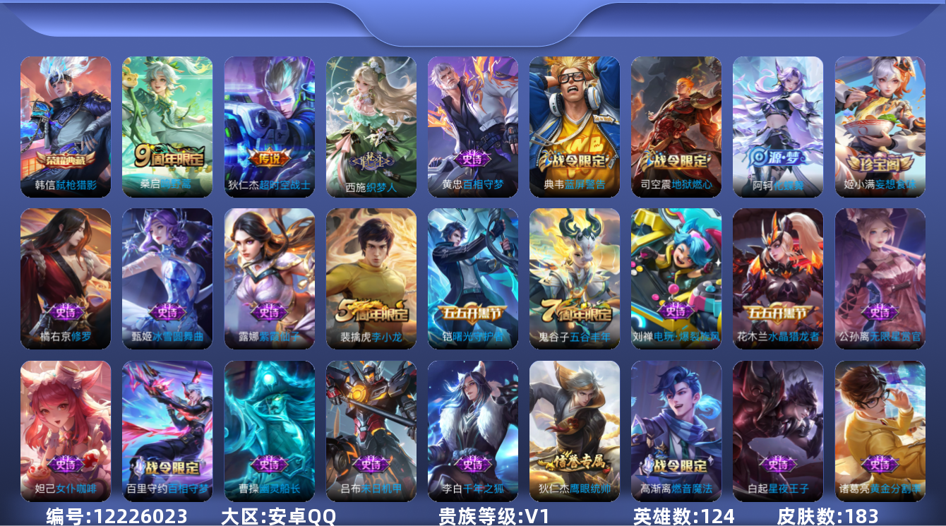 [12226023]1典藏 2传说 124英雄 183皮肤 可修改实名 优质装备:弑枪猎影(韩信典藏),超时空战士-狄仁杰 珍宝阁皮:妄想食味,万物之道 限定皮:逐霄战戟,鸣野蒿,五谷丰年,李小龙 史诗皮:化蝶舞,星界战将,蒙犽顽岩魄,蔬乡物语(鲁班七号),百相守梦-百里守约,百相守梦-黄忠,织梦人,紫霞仙子,黄金分割率,千年之狐,江河有灵,百解令(蒙犽),高渐离燃音魔法,无限星赏官,偶像歌手,电玩·爆裂旋风,末日机甲-吕布,乱世虎臣,节奏热浪,修罗,女仆咖啡,水果甜心,绅士熊喵,天才门将,星夜王子,暗隐猎兽者,幽灵船长,鬼剑武藏,舞动绿茵,地狱岩魂,缤纷独角兽,逐浪之夏,水晶猎龙者,曙光守护者,金属风暴,原初追逐者,鹰眼统帅,暗夜贵公子,魅力维加斯