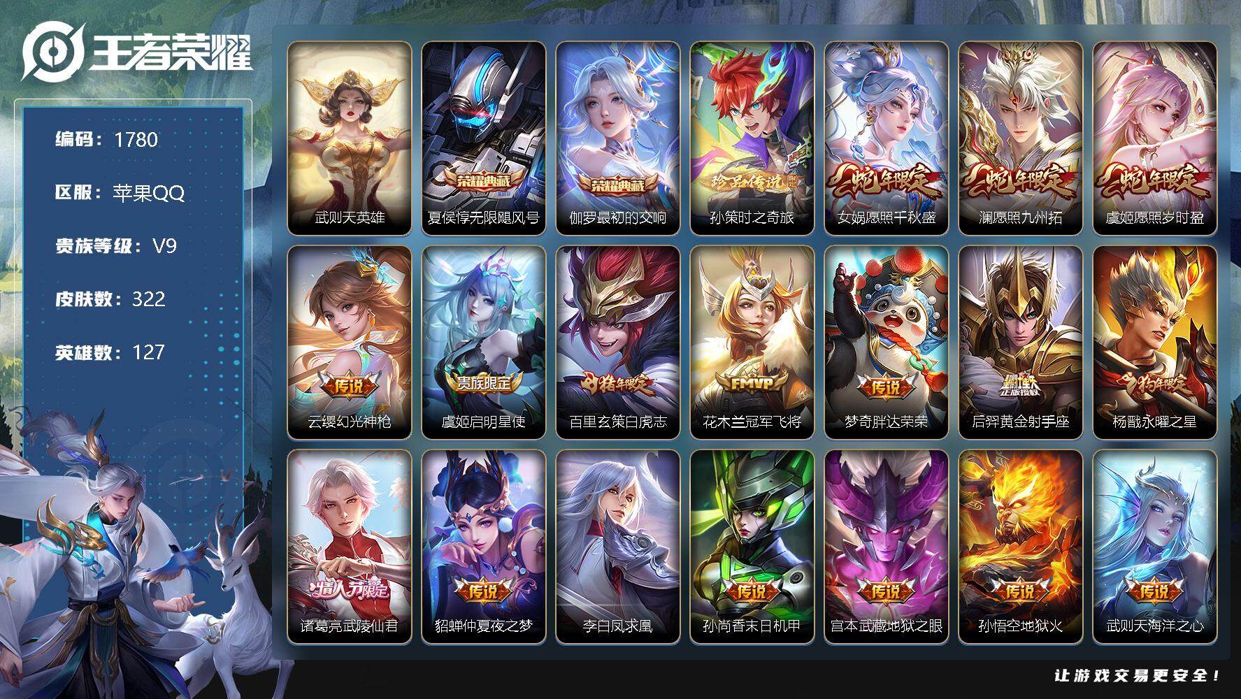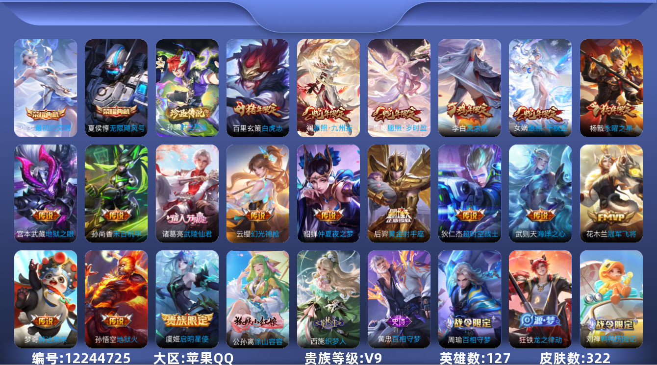 [12244725]【商品标题】:苹果Q-V9-永恒钻石III段位-127英雄-322皮肤-2典藏-0珍品无双-0无双-1珍品传说-18传说-88史诗