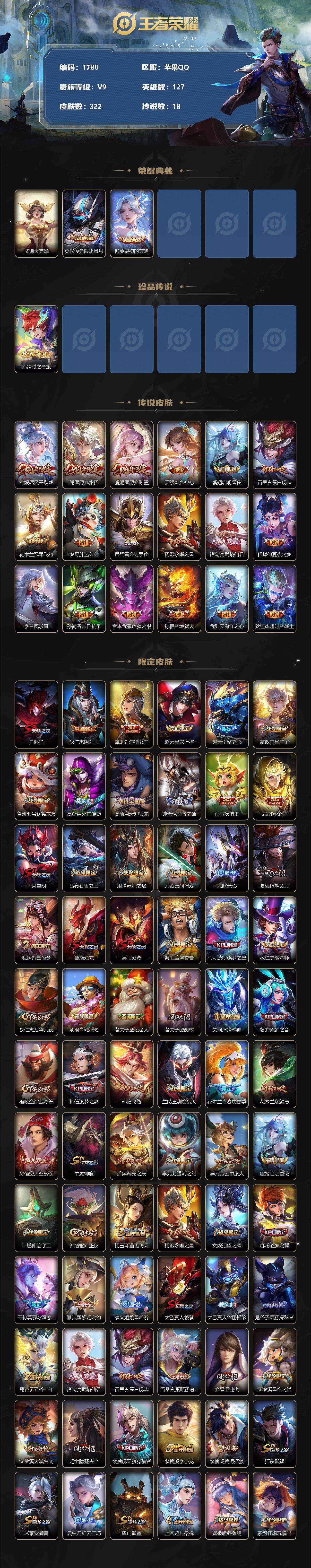 - [12031662]V9 5典藏 16传说 126英雄 336皮肤 典藏英雄武则天 可修改实名 优质装备:倪克斯神谕(宇宙婆娘),杀手不太冷,大秦宣太后,鸣剑·曳影,赤影疾锋,黄金白羊座,地狱火,李逍遥,超时空战士-狄仁杰,末日机甲-孙策,妄想实况 珍宝阁皮:优雅恋人,女武神,玩趣恶龙 限定皮:愿照·九州拓(澜年限),愿照·千秋盛(女娲年限),白虎志(电光耗子),凤求凰(白切鸡),凤凰于飞,飞衡(韩信年限),遇见飞天,高山流水,怒海麟威,五谷丰年,冰锋战神,武圣,游园惊梦,梁祝,天狼狩猎者,逐梦之星,李小龙,永曜之星,圣诞老人,奇迹圣诞,一生所爱,大圣娶亲,引擎之心,冰霜恋舞曲,蜜橘之夏,寅虎·瑞焰(虎皮蛋子),寅虎·赤拳(老虎年限),时之祈愿-云中君,山海·玄木吟(马可年限) 史诗皮:器灵·浮梦炉,化蝶舞,灵蛊蚀心,星界战将,百相守梦-黄忠,紫霞仙子,苍穹之光,白龙吟,黄金分割率,特工魅影,千年之狐,永昼,江河有灵,魅语,百解令(蒙犽),蒙恬荣光圣徽,无限星赏官,冰冠公主,偶像歌手,晚萤,暗夜猫娘,龙骑士(小龙虾),末日机甲-吕布,猫狗日记-孙策,猫狗日记-大乔,乱世虎臣,节奏热浪,修罗,女仆咖啡,摇滚巨星,水果甜心,绅士熊喵,天才门将,星夜王子,心灵骇客,功夫厨神,德古拉伯爵,暗隐猎兽者,幽灵船长,鬼剑武藏,暗渊魔法,心灵战警,天秀·启明,舞动绿茵,地狱岩魂,纤云弄巧,缤纷独角兽,乘风破浪,逐浪之夏,月团寄思,水晶猎龙者,曙光守护者,热力回旋,箭羽风息,金属风暴,原初追逐者,圣诞狂欢,圣诞恋歌,鹰眼统帅,暗夜贵公子,魅力维加斯,无心,未来纪元-赵云