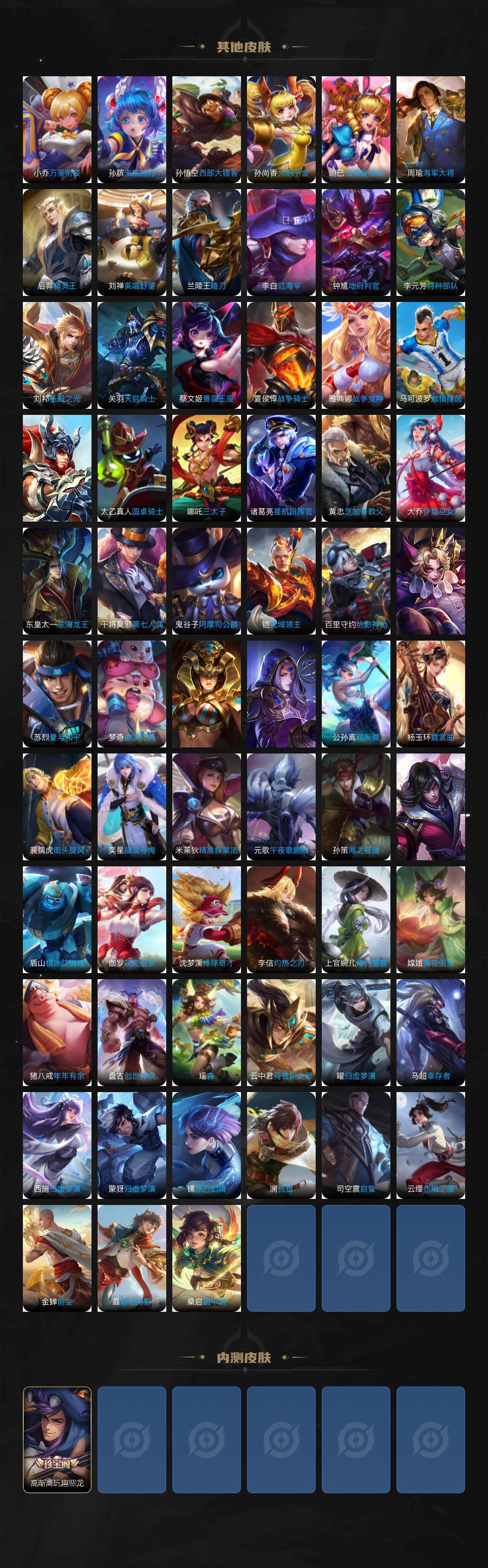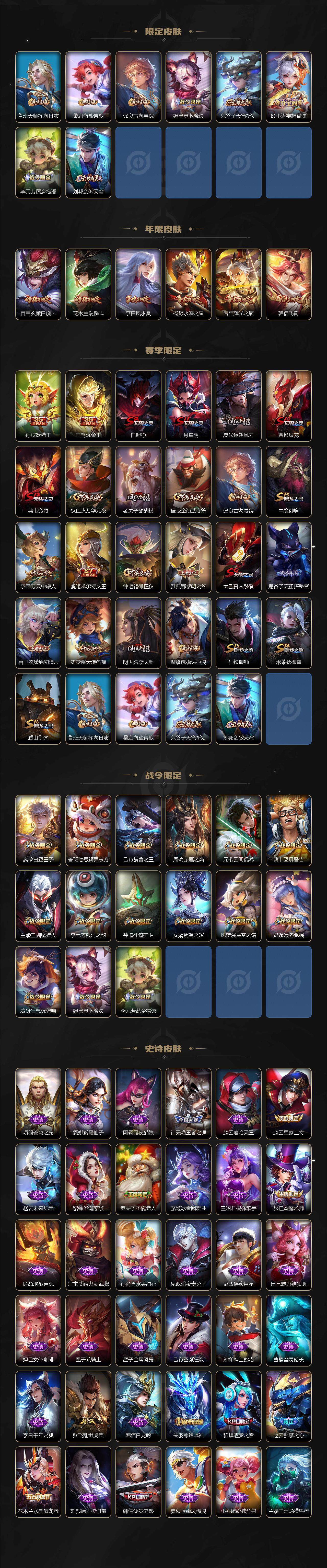 【限定皮肤】:白起狰,狄仁杰阴阳师,虞姬凯尔特女王,赵云皇家上将,赵云引擎之心,嬴政白昼王子,鲁班七号狮舞东方,高渐离死亡摇滚,高渐离玩趣恶龙,钟无艳王者之锤,孙膑妖精王,扁鹊炼金王,芈月重明,吕布猎兽之王,周瑜赤莲之焰,元歌云间偶戏,元歌无心,夏侯惇朔风刀,甄姬游园惊梦,曹操烛龙,典韦穷奇,典韦蓝屏警告,马可波罗逐梦之星,狄仁杰魔术师,狄仁杰万华元夜,项羽海滩派对,老夫子圣诞老人,老夫子醍醐杖,关羽冰锋战神,貂蝉逐梦之音,程咬金演武夺筹,韩信逐梦之影,韩信飞衡,兰陵王驯魔猎人,花木兰青春决赛季,花木兰瑞麟志,孙悟空大圣娶亲,牛魔御旌,后羿辉光之辰,李元芳银河之约,李元芳云中旅人,虞姬启明星使,钟馗神迹守卫,钟馗驱傩正仪,杨玉环遇见飞天,杨戬永曜之星,女娲朔望之晖,哪吒逐梦之翼,干将莫邪冰霜恋舞曲,雅典娜黎明之约,蔡文姬繁星吟游,太乙真人饕餮,太乙真人华丽摇滚,鬼谷子原初探秘者,鬼谷子五谷丰年,诸葛亮武陵仙君,百里玄策白虎志,百里玄策原初追逐者,弈星混沌棋,沈梦溪星空之诺,沈梦溪大漠名商,明世隐疑决卦,裴擒虎天狼狩猎者,裴擒虎李小龙,裴擒虎擒涛扼浪,狂铁御狮,米莱狄御霄,云中君纤云弄巧,盾山御銮,上官婉儿梁祝,嫦娥暖冬兔眠,蒙犽狂想玩偶喵,鲁班大师探海日志,桑启海盐诗旅,张良古海寻踪,妲己灵卜魔法,鬼谷子天穹祈灯,姬小满妄想食味,李元芳蔬乡物语,刘邦剑破天穹
