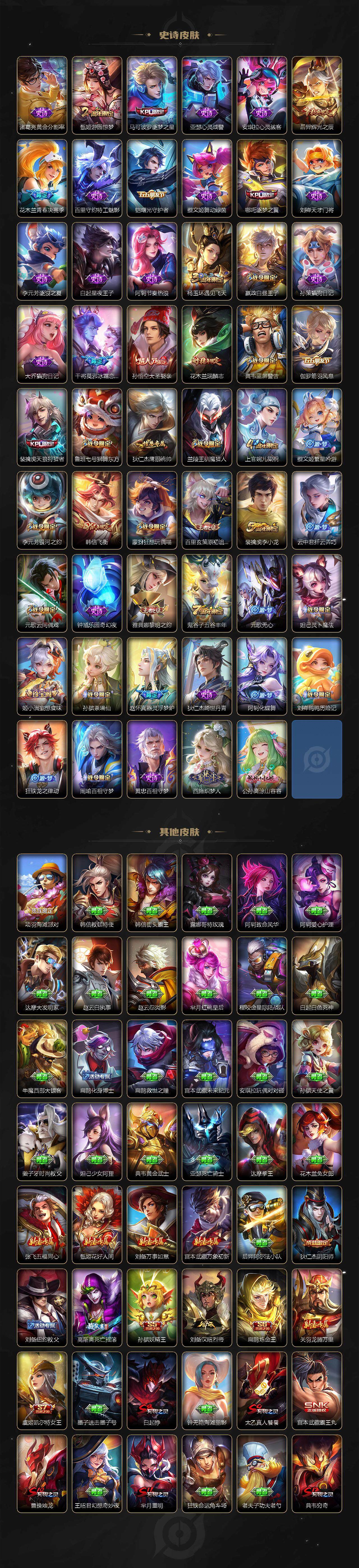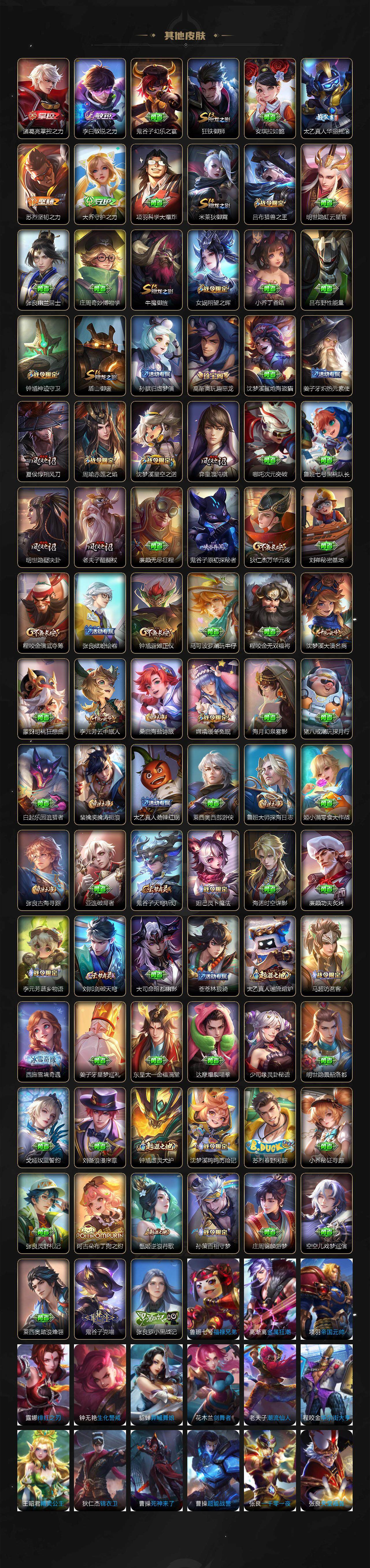 孙膑妖精王,扁鹊炼金王,虞姬凯尔特女王,白起狰,太乙真人饕餮,曹操烛龙,芈月重明,典韦穷奇,狂铁御狮,米莱狄御霄,牛魔御旌,盾山御銮,夏侯惇朔风刀,明世隐疑决卦,老夫子醍醐杖,鬼谷子原初探秘者,狄仁杰万华元夜,程咬金演武夺筹,钟馗驱傩正仪,吕布猎兽之王,嬴政白昼王子,女娲朔望之晖,典韦蓝屏警告,钟馗神迹守卫,鲁班七号狮舞东方,沈梦溪星空之诺,李元芳银河之约,蒙犽狂想玩偶喵,元歌云间偶戏,弈星混沌棋,沈梦溪大漠名商,李元芳云中旅人,桑启海盐诗旅,裴擒虎擒涛扼浪,鲁班大师探海日志,张良古海寻踪