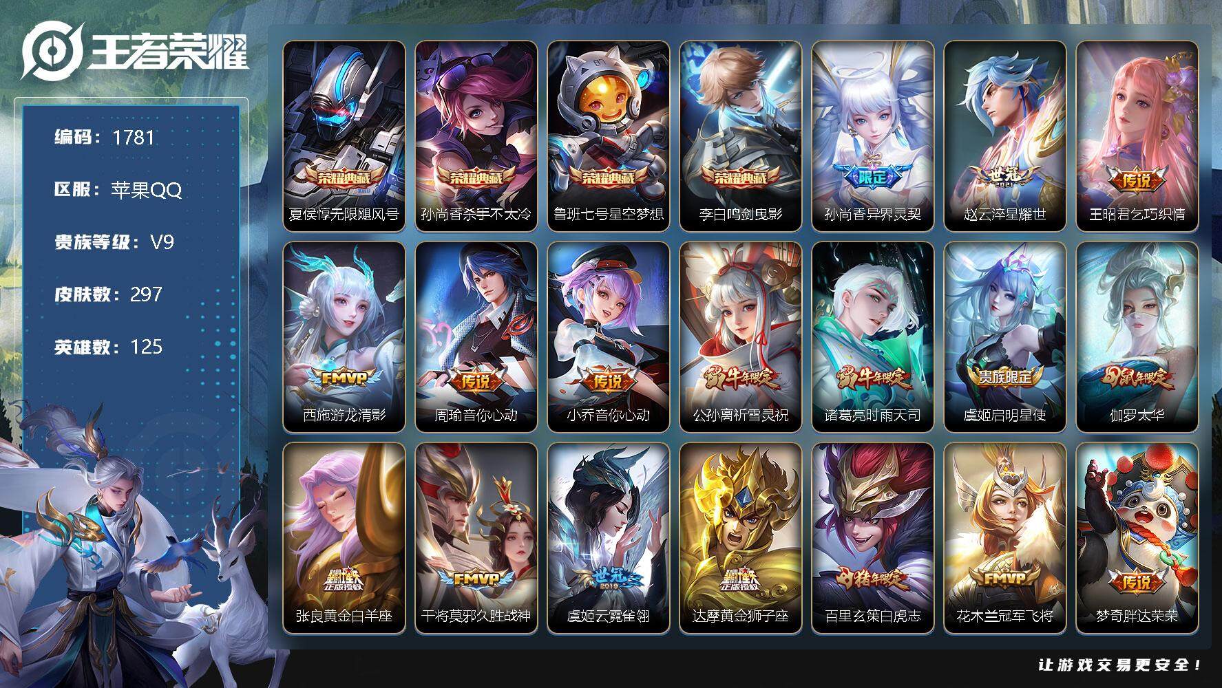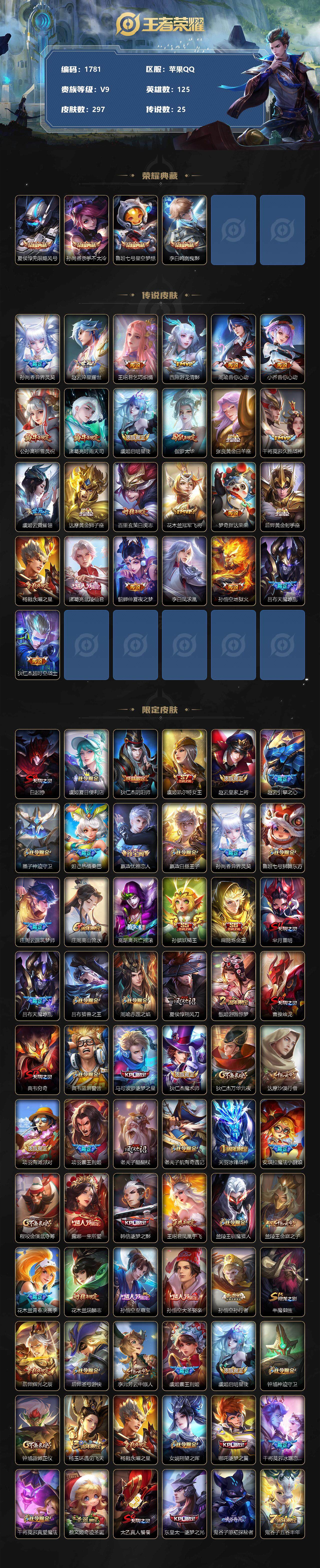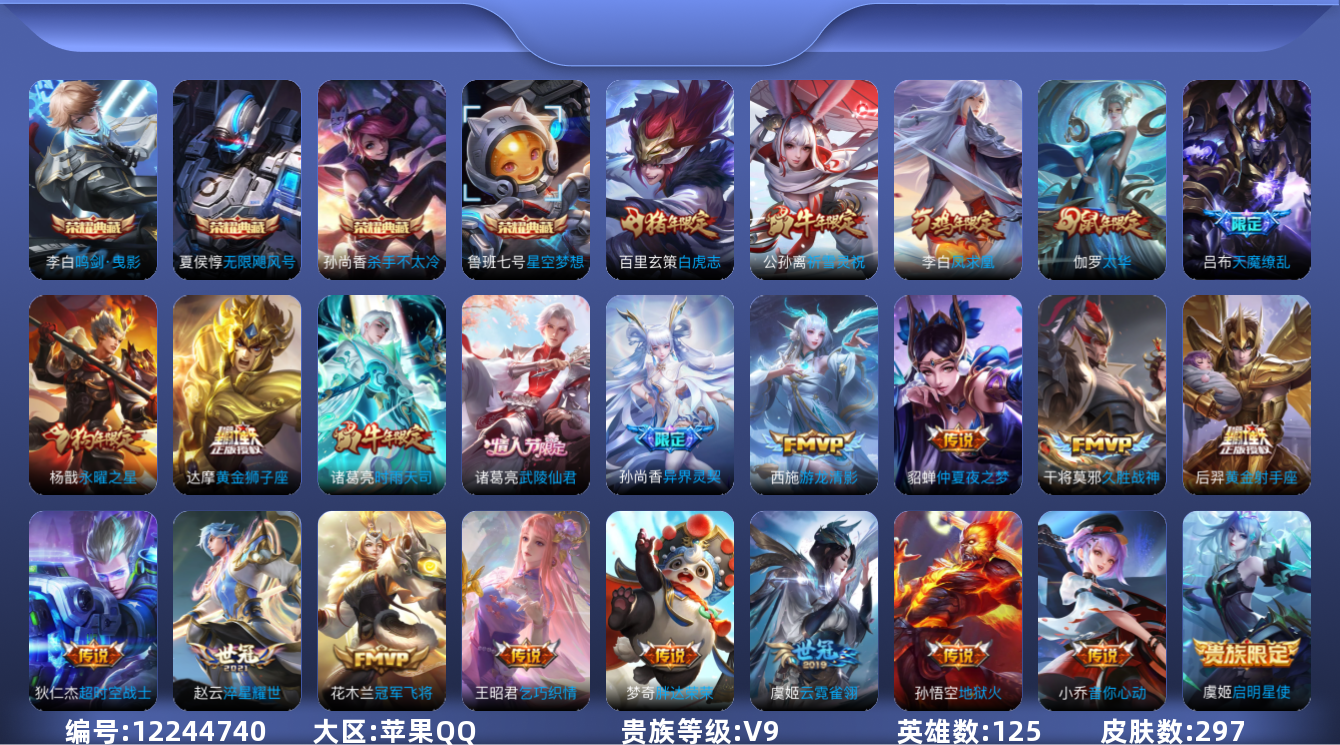 [12244740]【商品标题】:苹果Q-V9-永恒钻石II段位-125英雄-297皮肤-4典藏-0珍品无双-0无双-0珍品传说-25传说-96史诗