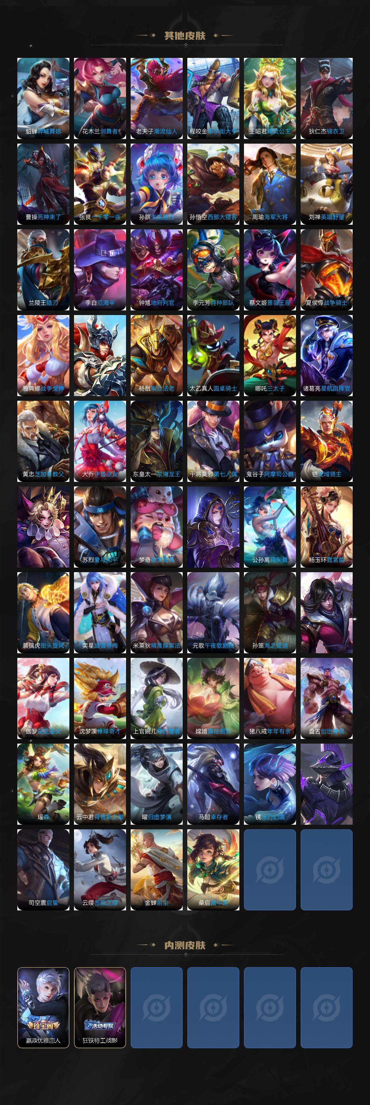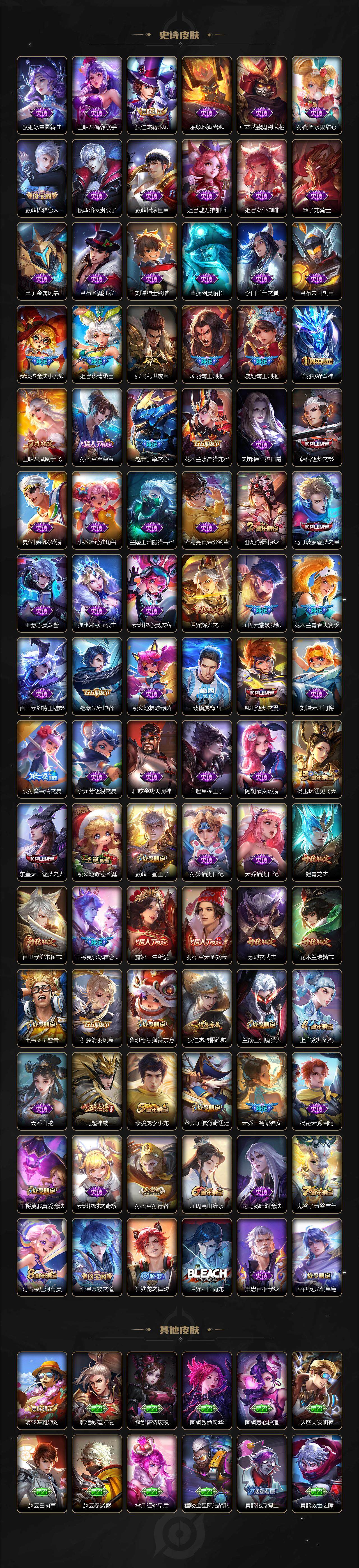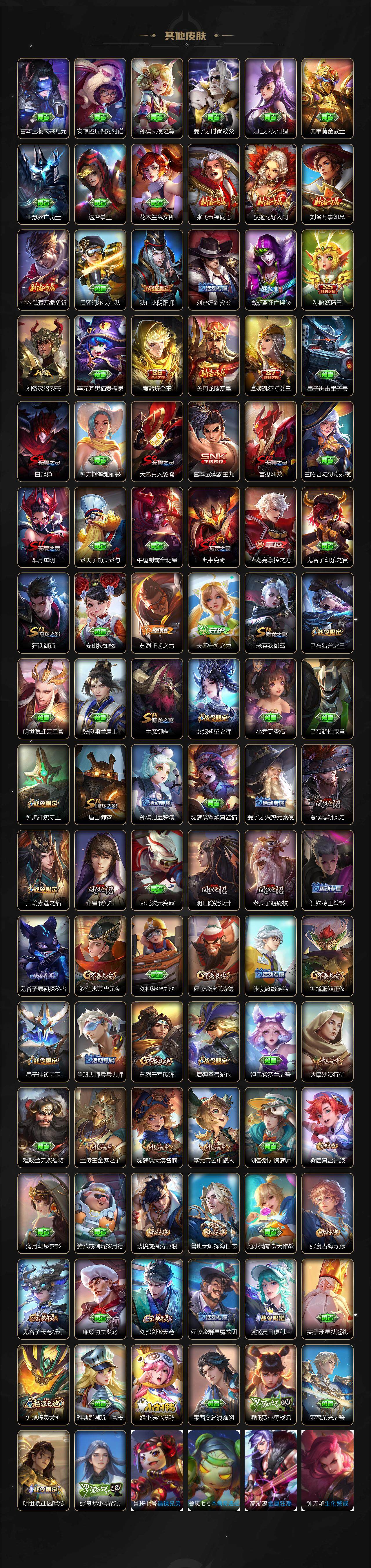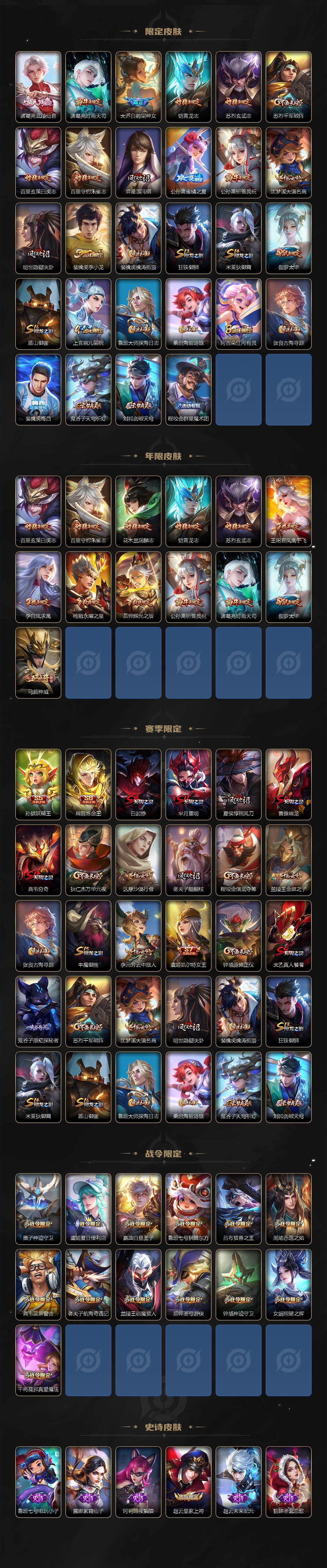 【限定皮肤】:白起狰,虞姬夏日便利店,狄仁杰阴阳师,虞姬凯尔特女王,赵云皇家上将,赵云引擎之心,墨子神迹守卫,妲己热情桑巴,嬴政优雅恋人,嬴政白昼王子,孙尚香异界灵契,鲁班七号狮舞东方,庄周云端筑梦师,庄周高山流水,高渐离死亡摇滚,孙膑妖精王,扁鹊炼金王,芈月重明,吕布天魔缭乱,吕布猎兽之王,周瑜赤莲之焰,夏侯惇朔风刀,甄姬游园惊梦,曹操烛龙,典韦穷奇,典韦蓝屏警告,马可波罗逐梦之星,狄仁杰魔术师,狄仁杰万华元夜,达摩沙漠行僧,项羽海滩派对,项羽霸王别姬,老夫子醍醐杖,老夫子航海奇遇记,关羽冰锋战神,安琪拉魔法小厨娘,程咬金演武夺筹,露娜一生所爱,韩信逐梦之影,王昭君凤凰于飞,兰陵王驯魔猎人,兰陵王金庭之子,花木兰青春决赛季,花木兰瑞麟志,孙悟空至尊宝,孙悟空大圣娶亲,孙悟空孙行者,牛魔御旌,后羿辉光之辰,后羿圣弓游侠,李元芳云中旅人,虞姬霸王别姬,虞姬启明星使,钟馗神迹守卫,钟馗驱傩正仪,杨玉环遇见飞天,杨戬永曜之星,女娲朔望之晖,哪吒逐梦之翼,干将莫邪冰霜恋舞曲,干将莫邪真爱魔法,蔡文姬奇迹圣诞,太乙真人饕餮,东皇太一逐梦之光,鬼谷子原初探秘者,鬼谷子五谷丰年,诸葛亮武陵仙君,诸葛亮时雨天司,大乔白鹤梁神女,铠青龙志,苏烈玄武志,苏烈千军破阵,百里玄策白虎志,百里守约朱雀志,弈星混沌棋,公孙离蜜橘之夏,公孙离祈雪灵祝,沈梦溪大漠名商,明世隐疑决卦,裴擒虎李小龙,裴擒虎擒涛扼浪,狂铁御狮,米莱狄御霄,伽罗太华,盾山御銮,上官婉儿梁祝,鲁班大师探海日志,桑启海盐诗旅,阿古朵江河有灵,张良古海寻踪,裴擒虎梅西,鬼谷子天穹祈灯,刘邦剑破天穹,程咬金群星魔术团