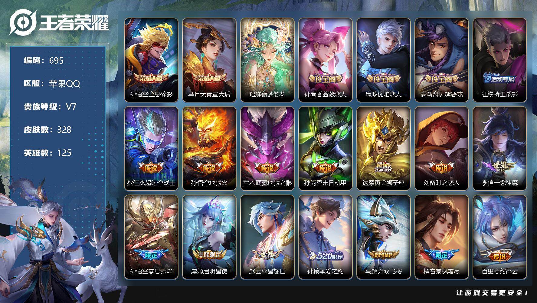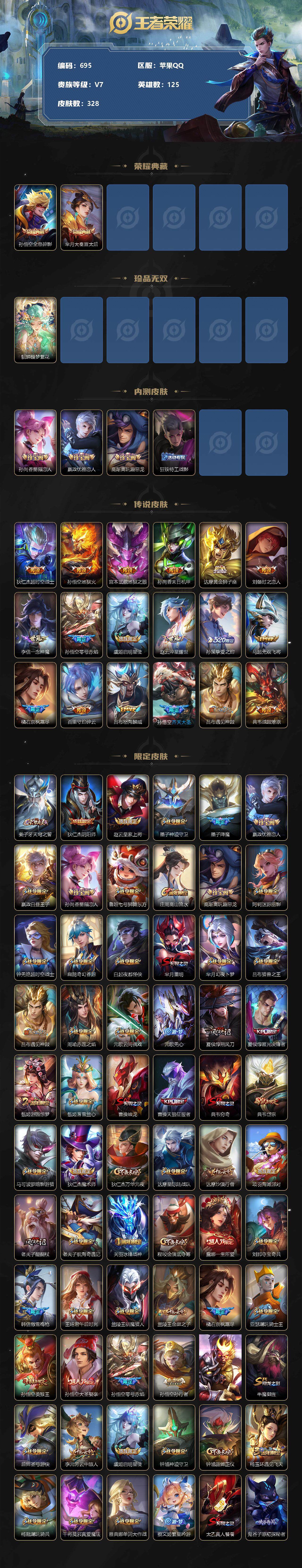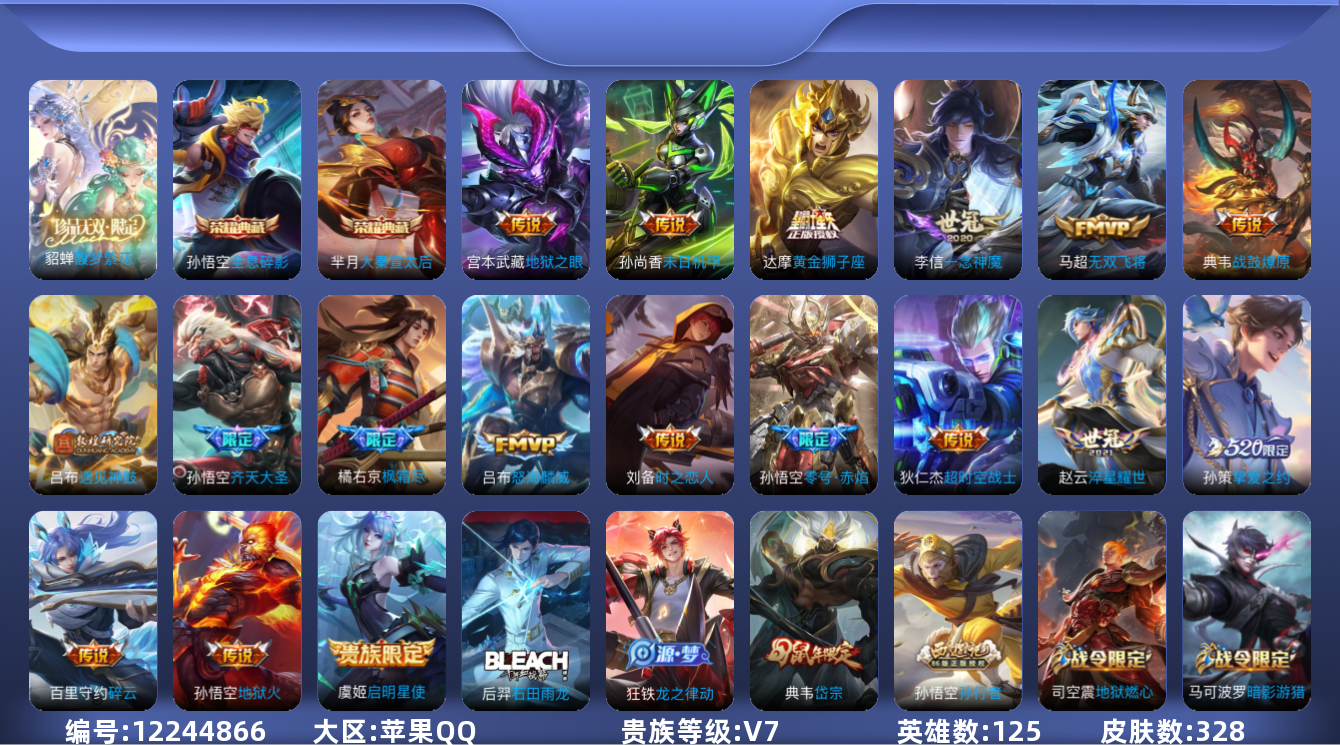 [12244866]【商品标题】:苹果Q-V7-永恒钻石II段位-125英雄-328皮肤-2典藏-1珍品无双-0无双-0珍品传说-18传说-97史诗