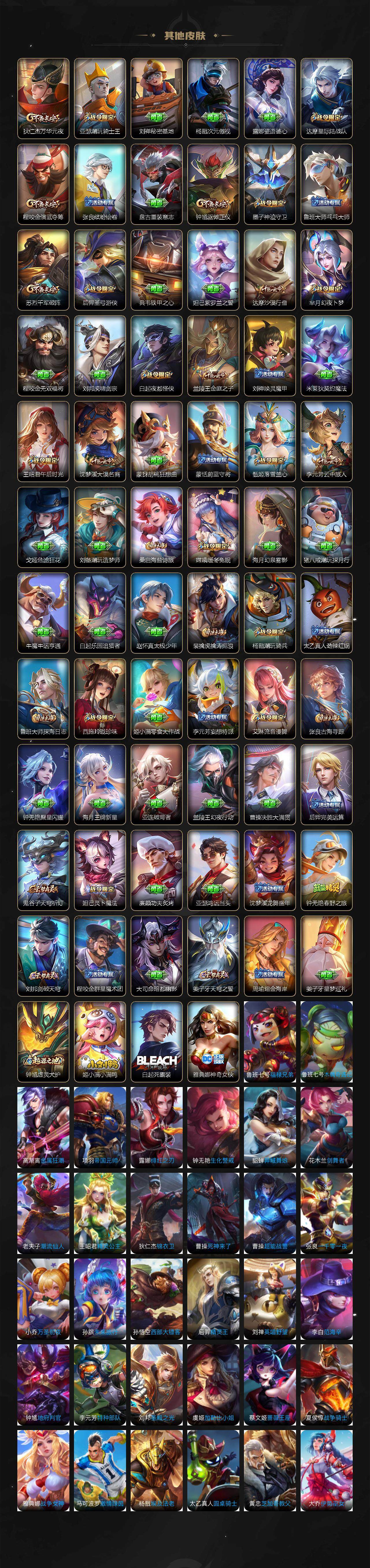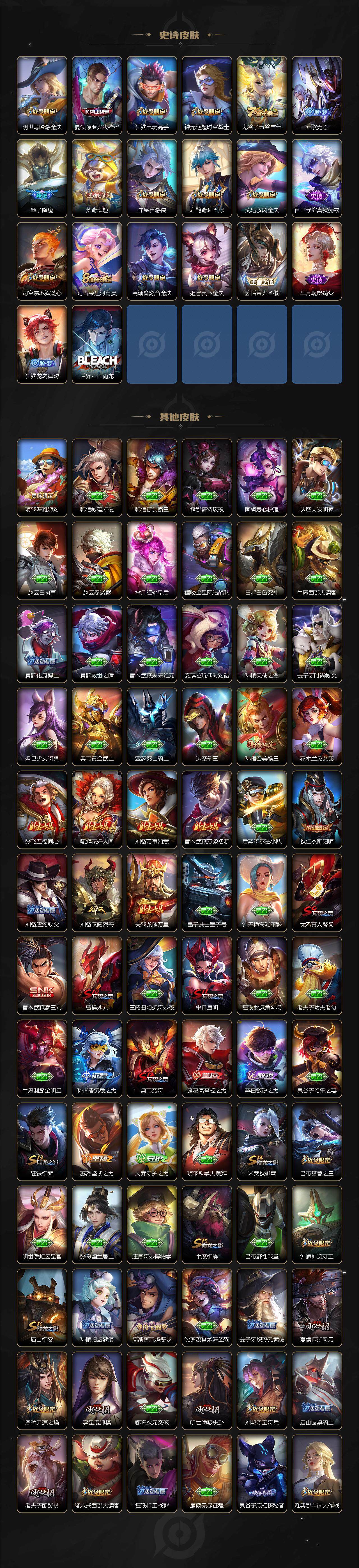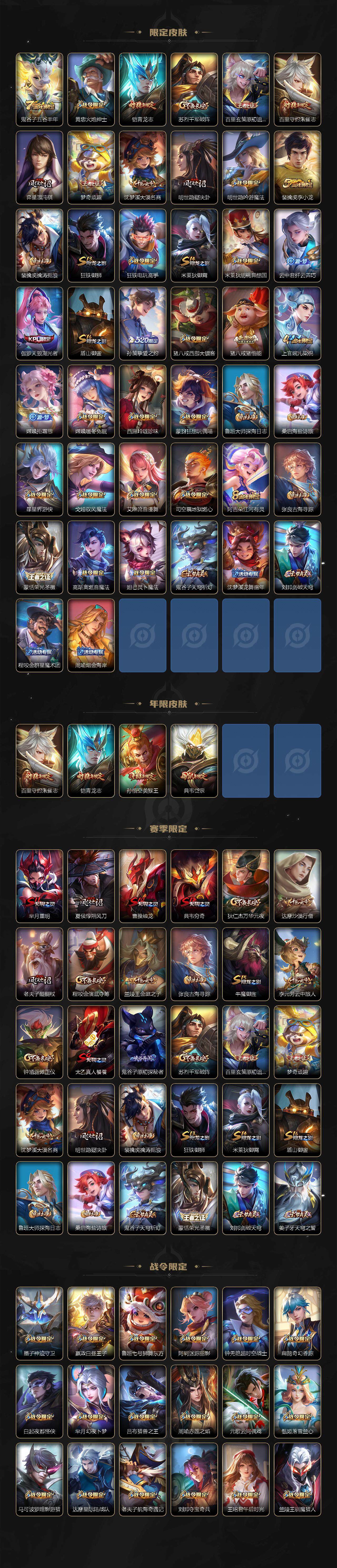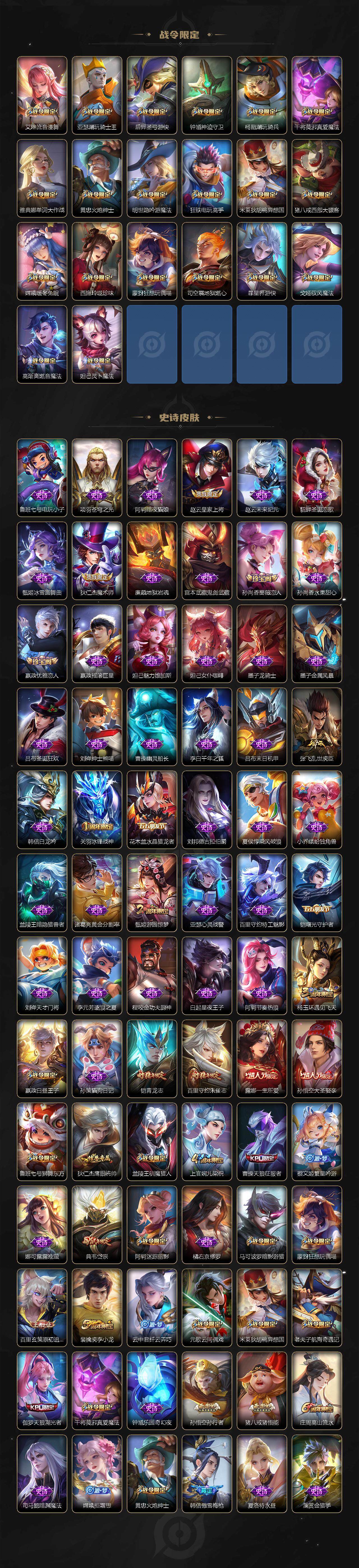 【限定皮肤】:姜子牙天穹之誓,狄仁杰阴阳师,赵云皇家上将,墨子神迹守卫,墨子降魔,嬴政优雅恋人,嬴政白昼王子,孙尚香蔷薇恋人,鲁班七号狮舞东方,庄周高山流水,高渐离玩趣恶龙,阿轲迷踪丽影,钟无艳超时空战士,扁鹊奇幻香踪,白起夜都怪侠,芈月重明,芈月幻夜卜梦,吕布猎兽之王,吕布遇见神鼓,周瑜赤莲之焰,元歌云间偶戏,元歌无心,夏侯惇朔风刀,夏侯惇匿光决锋者,甄姬游园惊梦,甄姬落雪兰心,曹操烛龙,曹操天狼征服者,典韦穷奇,典韦岱宗,马可波罗暗影游猎,狄仁杰魔术师,狄仁杰万华元夜,达摩星际陆战队,达摩沙漠行僧,项羽海滩派对,老夫子醍醐杖,老夫子航海奇遇记,关羽冰锋战神,程咬金演武夺筹,露娜一生所爱,刘邦夺宝奇兵,韩信傲雪梅枪,王昭君午后时光,兰陵王驯魔猎人,兰陵王金庭之子,橘右京枫霜尽,亚瑟潮玩骑士王,孙悟空美猴王,孙悟空大圣娶亲,孙悟空零号赤焰,孙悟空孙行者,孙悟空齐天大圣,牛魔御旌,后羿圣弓游侠,李元芳云中旅人,虞姬启明星使,钟馗神迹守卫,钟馗驱傩正仪,杨玉环遇见飞天,杨戬潮玩骑兵,干将莫邪真爱魔法,雅典娜单词大作战,蔡文姬繁星吟游,太乙真人饕餮,鬼谷子原初探秘者,鬼谷子五谷丰年,黄忠火炮绅士,铠青龙志,苏烈千军破阵,百里玄策原初追逐者,百里守约朱雀志,弈星混沌棋,梦奇顽趣,沈梦溪大漠名商,明世隐疑决卦,明世隐吟游魔法,裴擒虎李小龙,裴擒虎擒涛扼浪,狂铁御狮,狂铁电玩高手,米莱狄御霄,米莱狄胡桃异想国,云中君纤云弄巧,伽罗天狼溯光者,盾山御銮,孙策挚爱之约,猪八戒西部大镖客,猪八戒猪悟能,上官婉儿梁祝,嫦娥拒霜思,嫦娥暖冬兔眠,西施玲珑珍味,蒙犽狂想玩偶喵,鲁班大师探海日志,桑启海盐诗旅,暃星界游侠,戈娅驭风魔法,艾琳