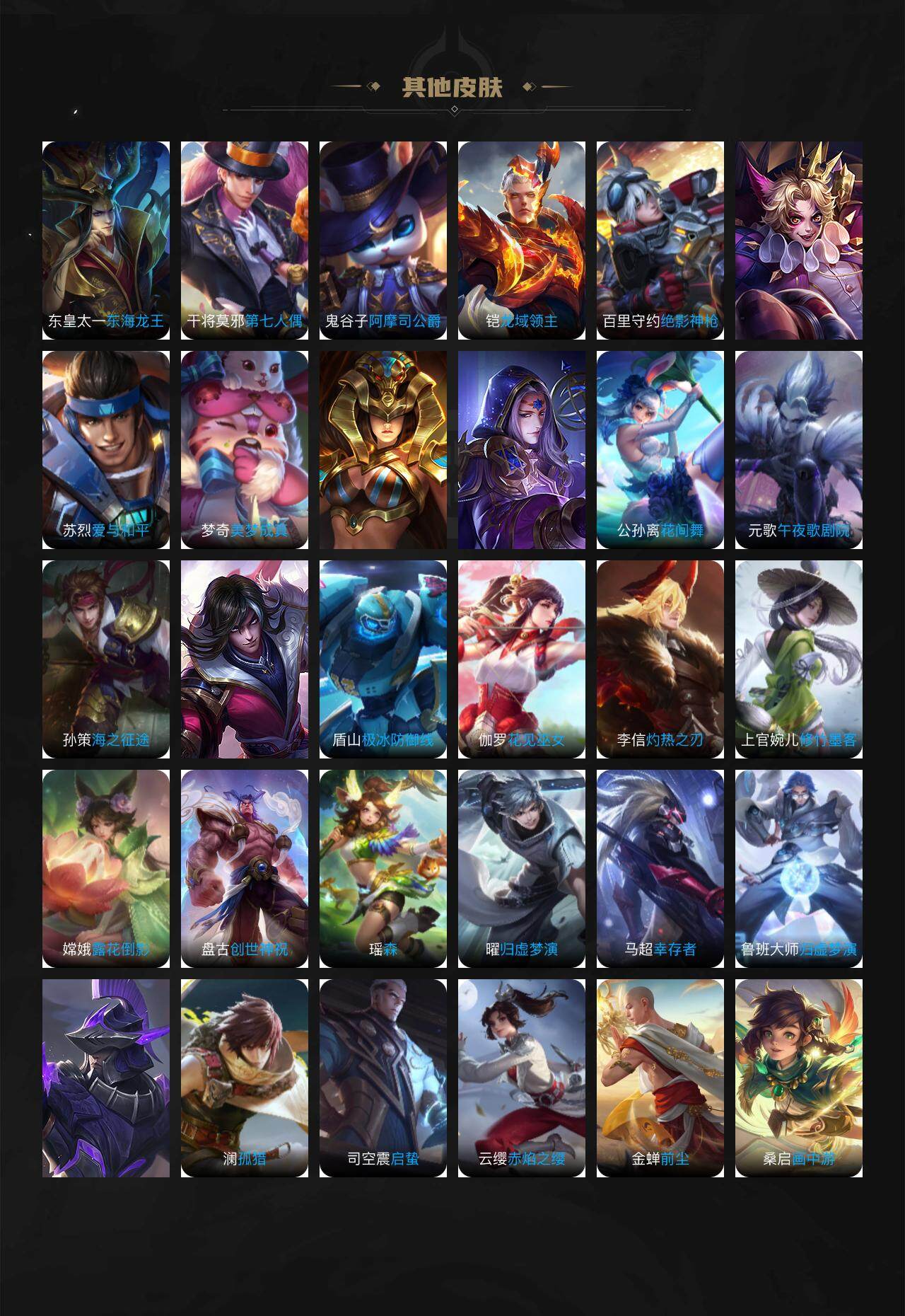 娜可露露晚萤,李元芳逐浪之夏,孙策猫狗日记,阿轲节奏热浪,诸葛亮黄金分割率,韩信白龙吟,项羽苍穹之光,阿轲暗夜猫娘,吕布末日机甲,鲁班七号电玩小子,橘右京修罗,墨子龙骑士,嬴政摇滚巨星,刘禅绅士熊喵,刘禅天才门将,白起星夜王子,程咬金功夫厨神,刘邦德古拉伯爵,兰陵王暗隐猎兽者,曹操幽灵船长,宫本武藏鬼剑武藏,司马懿暗渊魔法,亚瑟心灵战警,钟馗乐园奇幻夜,廉颇地狱岩魂,小乔缤纷独角兽,夏侯惇乘风破浪,花木兰水晶猎龙者,铠曙光守护者,墨子金属风暴,百里玄策原初追逐者,吕布圣诞狂欢,貂蝉圣诞恋歌,百里守约特工魅影,嫦娥拒霜思,李白千年之狐,夏洛特永昼,澜赏金猎手,百里守约真我赫兹,高渐离燃音魔法