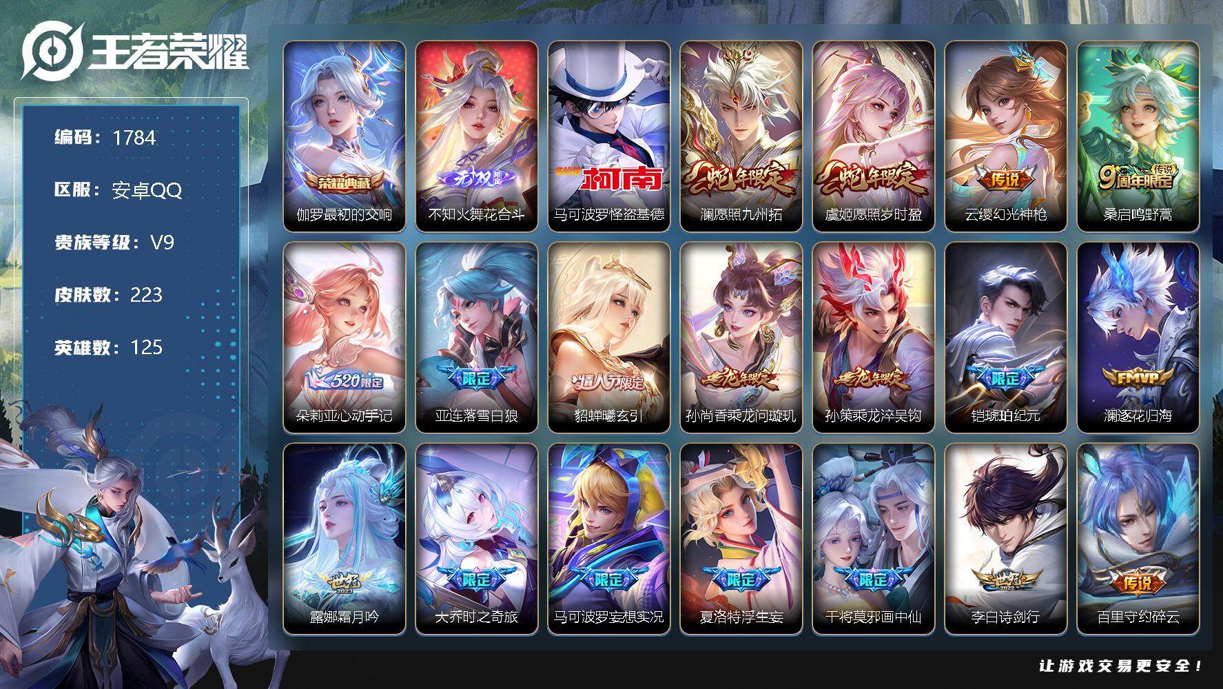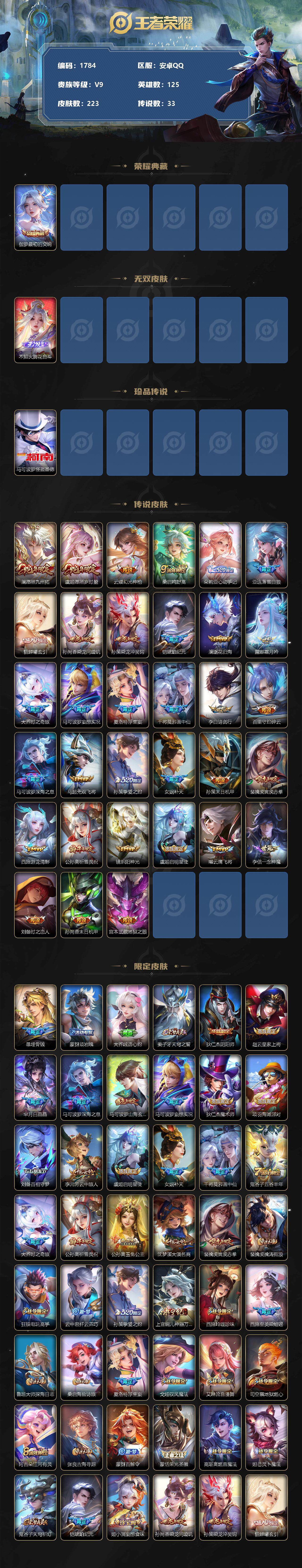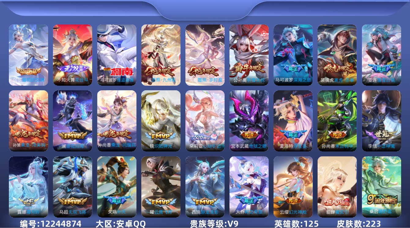 [12244874]【商品标题】:安卓Q-V9-尊贵铂金II段位-125英雄-223皮肤-1典藏-0珍品无双-1无双-1珍品传说-33传说-68史诗