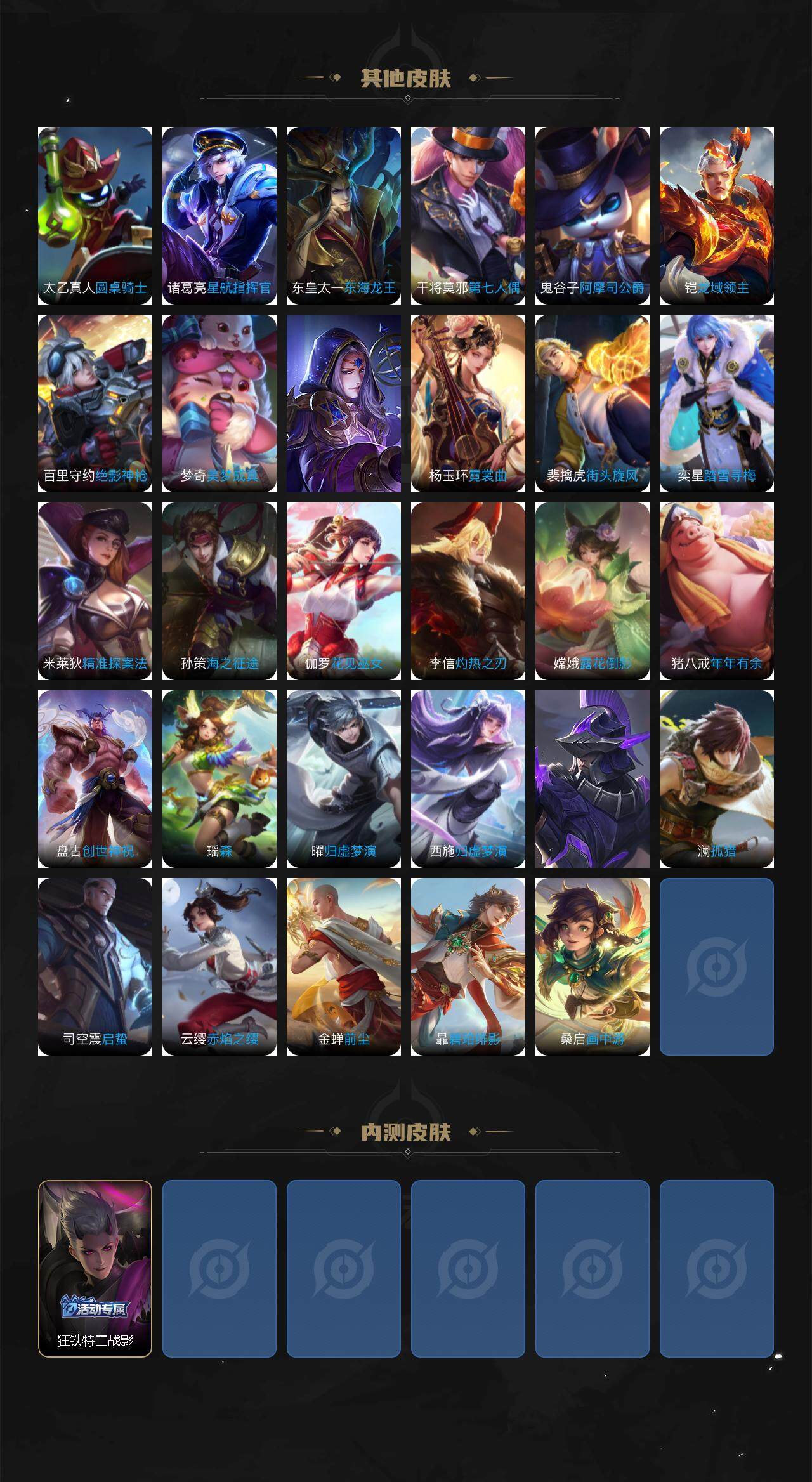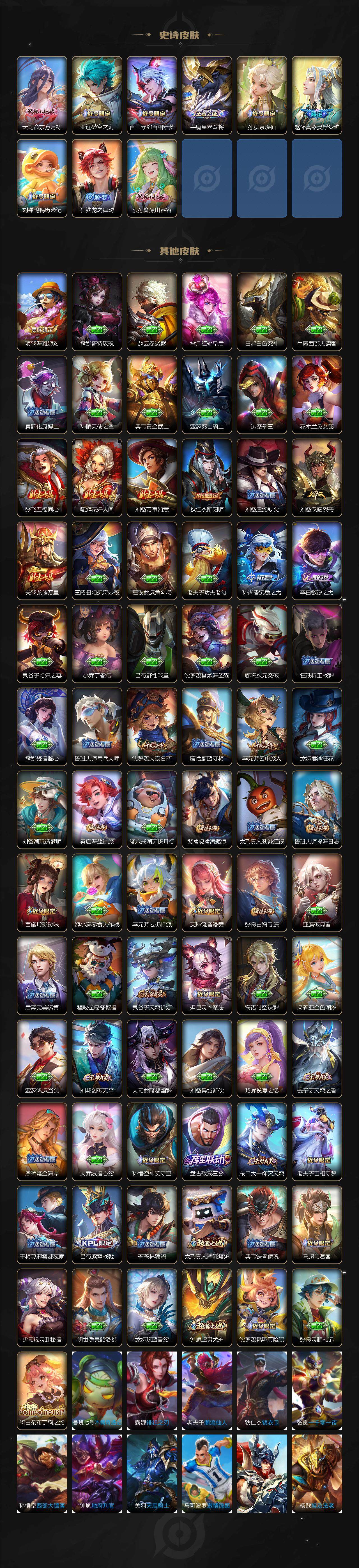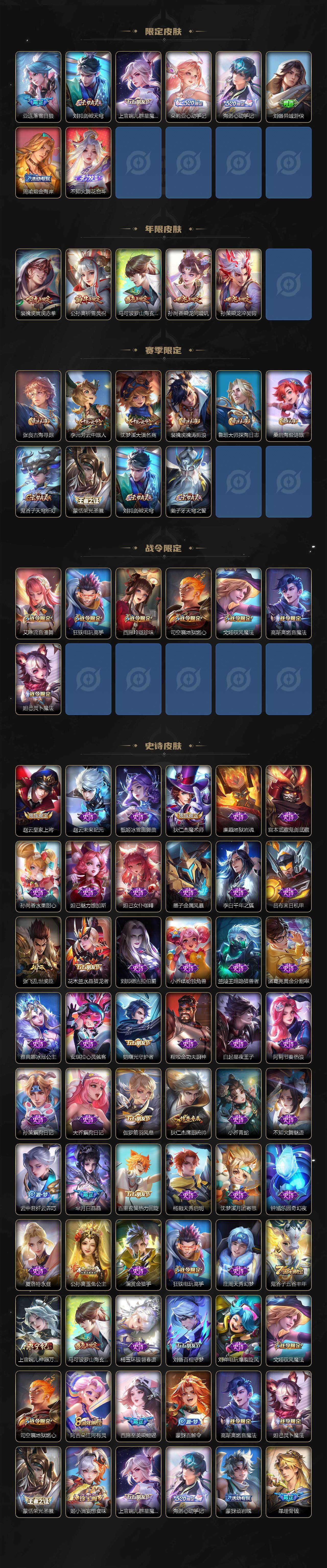 【限定皮肤】:暃埋骨钱,蒙犽顽岩魄,大乔绒语心约,姜子牙天穹之誓,狄仁杰阴阳师,赵云皇家上将,芈月白晶晶,马可波罗深海之息,马可波罗山海玄木吟,马可波罗妄想实况,狄仁杰魔术师,项羽海滩派对,刘备百相守梦,李元芳云中旅人,虞姬启明星使,女娲补天,干将莫邪画中仙,鬼谷子五谷丰年,大乔时之奇旅,公孙离祈雪灵祝,公孙离玉兔公主,沈梦溪大漠名商,裴擒虎寅虎赤拳,裴擒虎擒涛扼浪,狂铁电玩高手,云中君纤云弄巧,孙策挚爱之约,上官婉儿神器万象笔,西施玲珑珍味,西施至美乘鲤谣,鲁班大师探海日志,桑启海盐诗旅,夏洛特浮生妄,戈娅驭风魔法,艾琳流音漫舞,司空震地狱燃心,阿古朵江河有灵,张良古海寻踪,蒙犽百解令,蒙恬荣光圣徽,高渐离燃音魔法,妲己灵卜魔法,鬼谷子天穹祈灯,铠琥珀纪元,姬小满妄想食味,孙尚香乘龙问璇玑,孙策乘龙淬吴钩,貂蝉曦玄引,亚连落雪白狼,刘邦剑破天穹,上官婉儿群星魔术团,朵莉亚心动手记,海诺心动手记,刘备异域游侠,周瑜熔金海岸,不知火舞花合斗