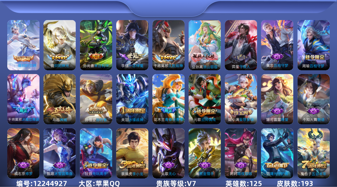 [12244927]【商品标题】:苹果Q-V7-最强王者段位-125英雄-193皮肤-1典藏-0珍品无双-0无双-0珍品传说-4传说-56史诗