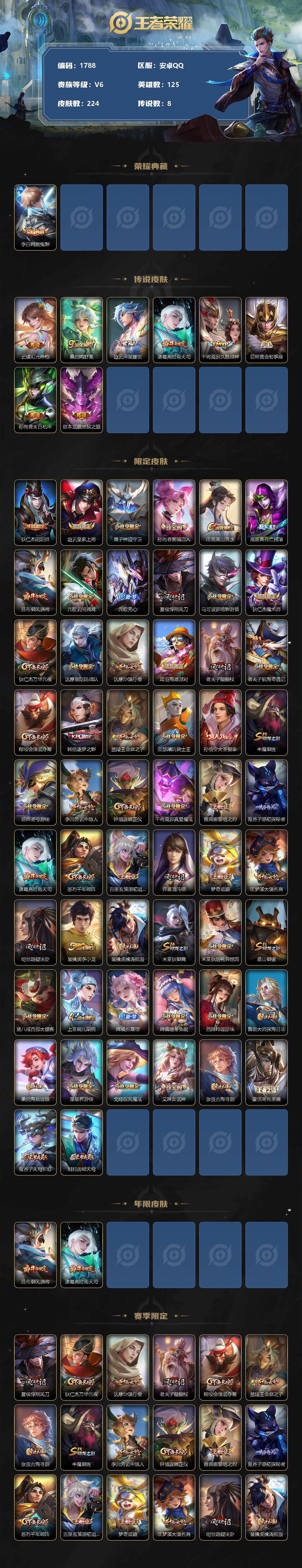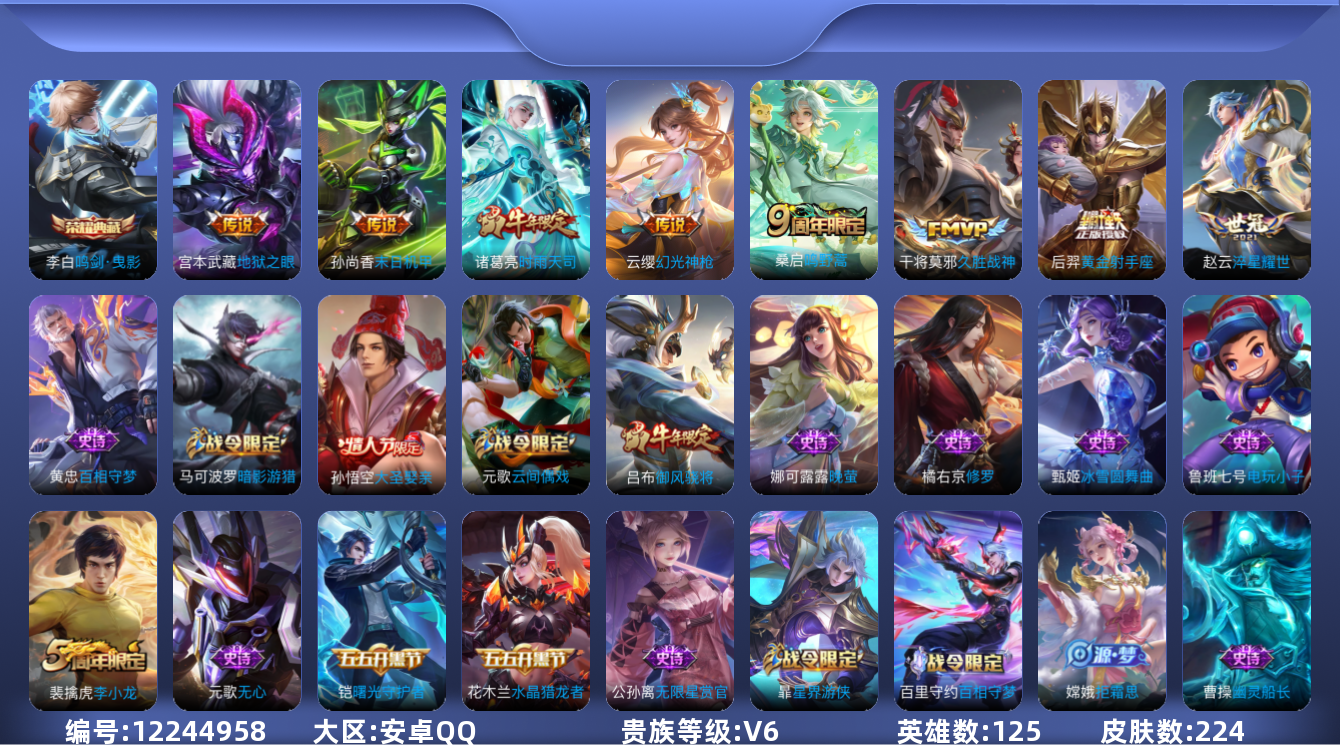 [12244958]【商品标题】:安卓Q-V6-至尊星耀V段位-125英雄-224皮肤-1典藏-0珍品无双-0无双-0珍品传说-8传说-59史诗