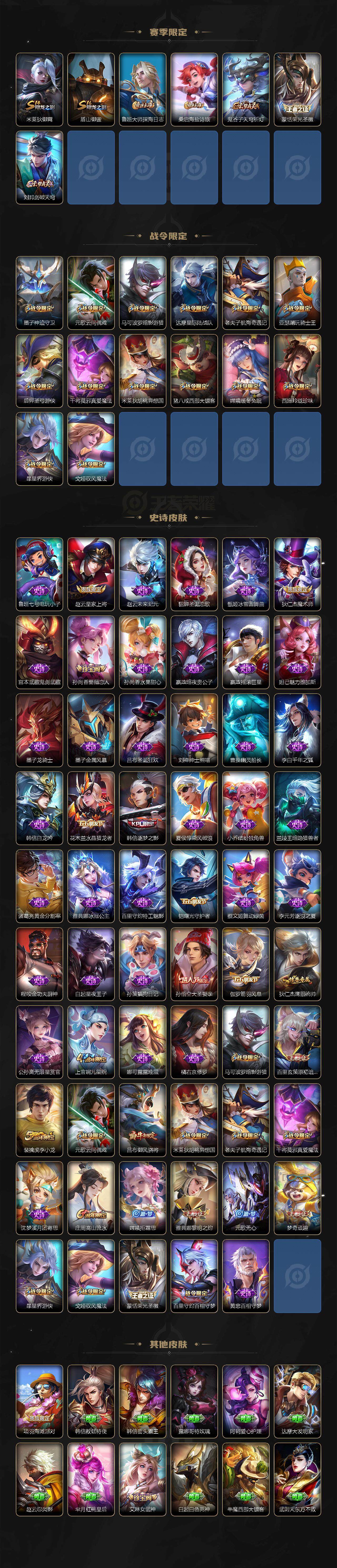【限定皮肤】:狄仁杰阴阳师,赵云皇家上将,墨子神迹守卫,孙尚香蔷薇恋人,庄周高山流水,高渐离死亡摇滚,吕布御风骁将,元歌云间偶戏,元歌无心,夏侯惇朔风刀,马可波罗暗影游猎,狄仁杰魔术师,狄仁杰万华元夜,达摩星际陆战队,达摩沙漠行僧,项羽海滩派对,老夫子醍醐杖,老夫子航海奇遇记,程咬金演武夺筹,韩信逐梦之影,兰陵王金庭之子,亚瑟潮玩骑士王,孙悟空大圣娶亲,牛魔御旌,后羿圣弓游侠,李元芳云中旅人,钟馗驱傩正仪,干将莫邪真爱魔法,雅典娜黎明之约,鬼谷子原初探秘者,诸葛亮时雨天司,苏烈千军破阵,百里玄策原初追逐者,弈星混沌棋,梦奇顽趣,沈梦溪大漠名商,明世隐疑决卦,裴擒虎李小龙,裴擒虎擒涛扼浪,米莱狄御霄,米莱狄胡桃异想国,盾山御銮,猪八戒西部大镖客,上官婉儿梁祝,嫦娥拒霜思,嫦娥暖冬兔眠,西施玲珑珍味,鲁班大师探海日志,桑启海盐诗旅,暃星界游侠,戈娅驭风魔法,艾琳女武神,张良古海寻踪,蒙恬荣光圣徽,鬼谷子天穹祈灯,刘邦剑破天穹