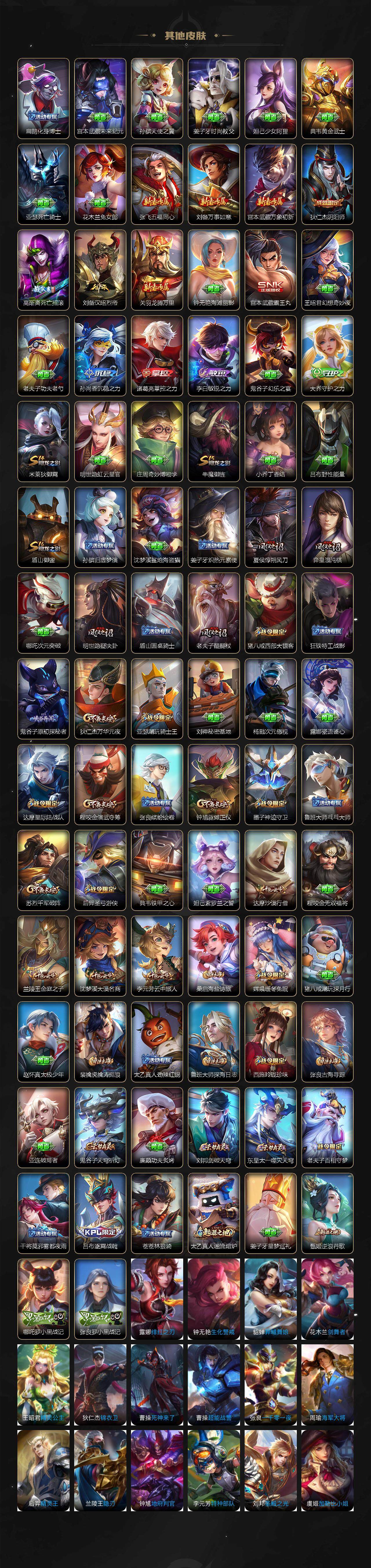 娜可露露晚萤,伽罗箭羽风息,李元芳逐浪之夏,公孙离无限星赏官,孙策猫狗日记,诸葛亮黄金分割率,韩信白龙吟,雅典娜冰冠公主,鲁班七号电玩小子,橘右京修罗,墨子龙骑士,嬴政摇滚巨星,刘禅绅士熊喵,白起星夜王子,程咬金功夫厨神,兰陵王暗隐猎兽者,曹操幽灵船长,宫本武藏鬼剑武藏,蔡文姬舞动绿茵,小乔缤纷独角兽,夏侯惇乘风破浪,花木兰水晶猎龙者,铠曙光守护者,墨子金属风暴,百里玄策原初追逐者,吕布圣诞狂欢,貂蝉圣诞恋歌,百里守约特工魅影,嬴政暗夜贵公子,嫦娥拒霜思,雅典娜黎明之约,李白千年之狐