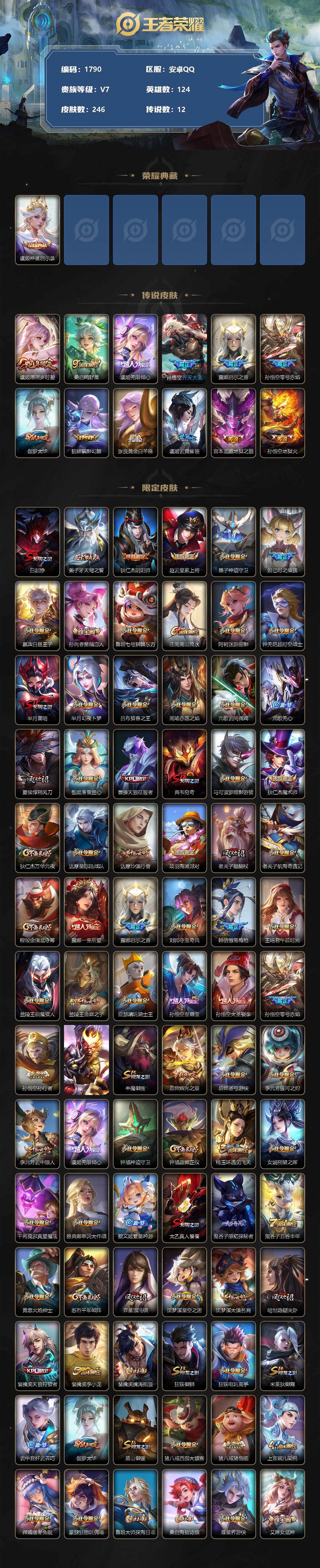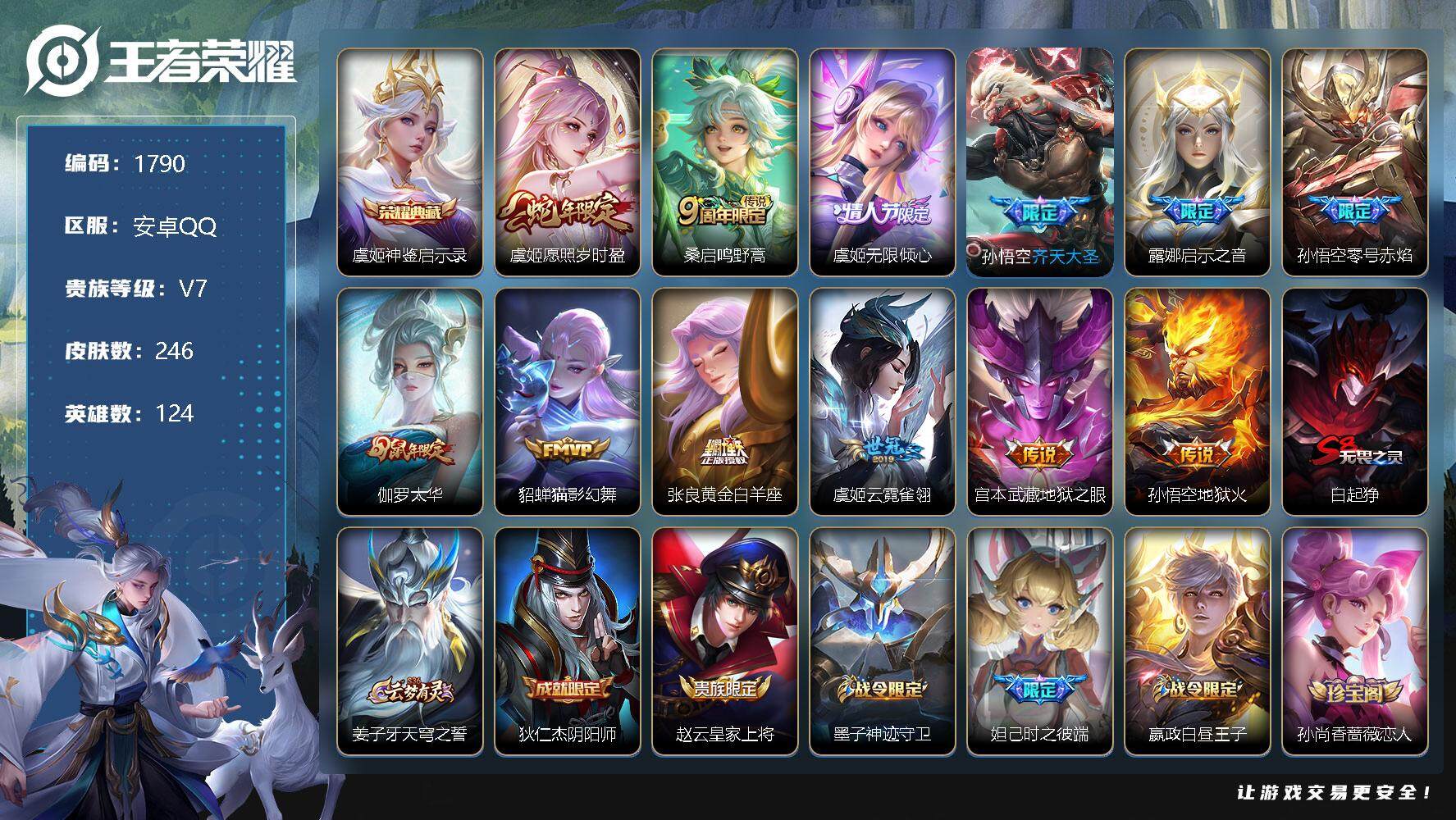 [12245016]【商品标题】:安卓Q-V7-尊贵铂金III段位-124英雄-246皮肤-1典藏-0珍品无双-0无双-0珍品传说-12传说-60史诗