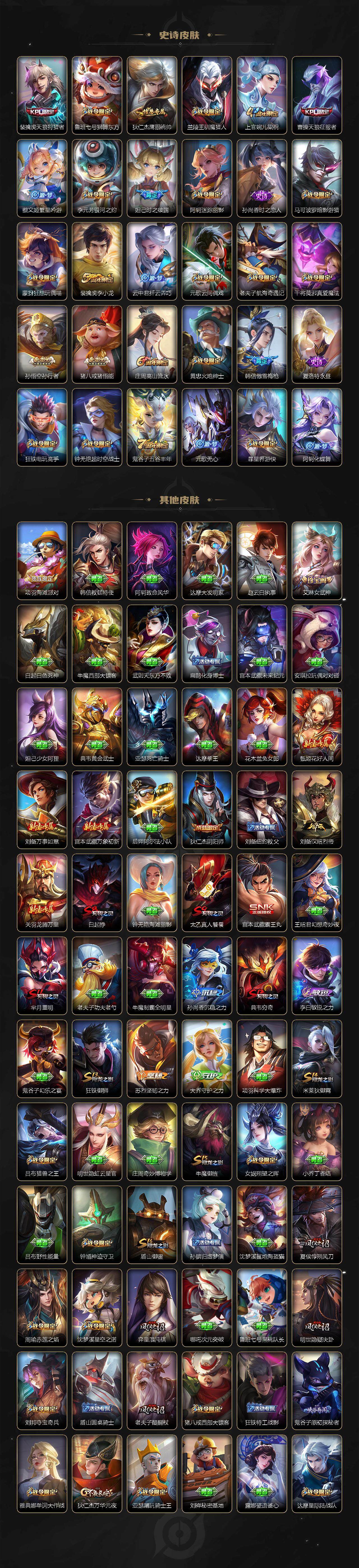 【限定皮肤】:白起狰,姜子牙天穹之誓,狄仁杰阴阳师,赵云皇家上将,墨子神迹守卫,妲己时之彼端,嬴政白昼王子,孙尚香蔷薇恋人,鲁班七号狮舞东方,庄周高山流水,阿轲迷踪丽影,钟无艳超时空战士,芈月重明,芈月幻夜卜梦,吕布猎兽之王,周瑜赤莲之焰,元歌云间偶戏,元歌无心,夏侯惇朔风刀,甄姬落雪兰心,曹操天狼征服者,典韦穷奇,马可波罗暗影游猎,狄仁杰魔术师,狄仁杰万华元夜,达摩星际陆战队,达摩沙漠行僧,项羽海滩派对,老夫子醍醐杖,老夫子航海奇遇记,程咬金演武夺筹,露娜一生所爱,露娜启示之音,刘邦夺宝奇兵,韩信傲雪梅枪,王昭君午后时光,兰陵王驯魔猎人,兰陵王金庭之子,亚瑟潮玩骑士王,孙悟空至尊宝,孙悟空大圣娶亲,孙悟空零号赤焰,孙悟空孙行者,孙悟空齐天大圣,牛魔御旌,后羿辉光之辰,后羿圣弓游侠,李元芳银河之约,李元芳云中旅人,虞姬无限倾心,钟馗神迹守卫,钟馗驱傩正仪,杨玉环遇见飞天,女娲朔望之晖,干将莫邪真爱魔法,雅典娜单词大作战,蔡文姬繁星吟游,太乙真人饕餮,鬼谷子原初探秘者,鬼谷子五谷丰年,黄忠火炮绅士,苏烈千军破阵,弈星混沌棋,沈梦溪星空之诺,沈梦溪大漠名商,明世隐疑决卦,裴擒虎天狼狩猎者,裴擒虎李小龙,裴擒虎擒涛扼浪,狂铁御狮,狂铁电玩高手,米莱狄御霄,云中君纤云弄巧,伽罗太华,盾山御銮,猪八戒西部大镖客,猪八戒猪悟能,上官婉儿梁祝,嫦娥暖冬兔眠,蒙犽狂想玩偶喵,鲁班大师探海日志,桑启海盐诗旅,暃星界游侠,艾琳女武神,张良古海寻踪,鬼谷子天穹祈灯