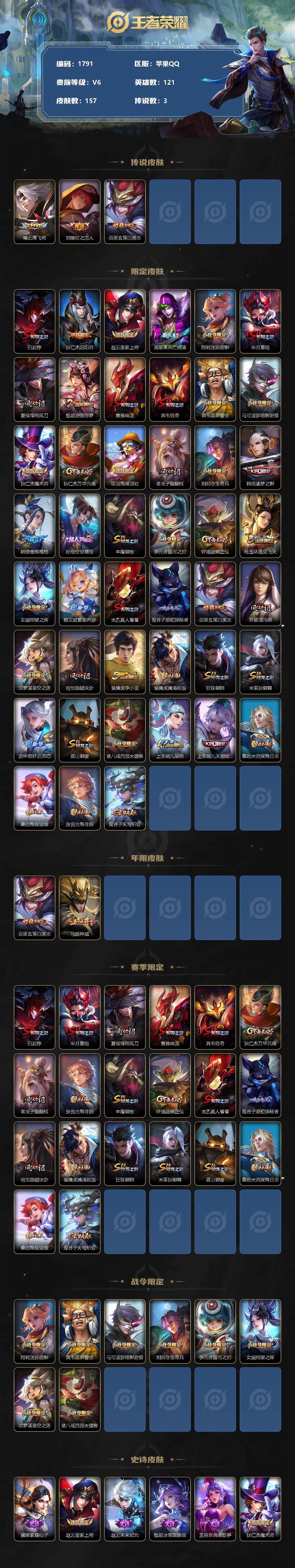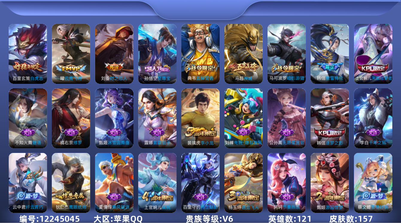 [12245045]【商品标题】:苹果Q-V0-永恒钻石IV段位-121英雄-157皮肤-0典藏-0珍品无双-0无双-0珍品传说-3传说-39史诗