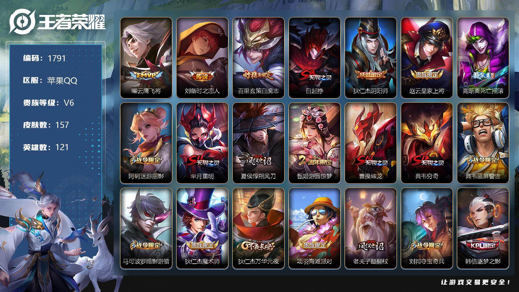 - [12074847]V6 1典藏 7传说 123英雄 181皮肤 可修改实名 优质装备:弑枪猎影(韩信典藏),云霓雀翎,飞鸢探春,神器·狴犴令,涂山容容 传说皮:幻光神枪 珍宝阁皮:蔷薇恋人,女武神,玩趣恶龙 限定皮:愿照·九州拓(澜年限),鸣野蒿,至尊宝,齐天大圣,五谷丰年,游园惊梦,李小龙,如梦令-后羿,孙行者,大圣娶亲 史诗皮:化蝶舞,石田雨龙,茶境仙,蔬乡物语(鲁班七号),百相守梦-黄忠,紫霞仙子,黄金分割率,特工魅影,千年之狐,江河有灵,偶像歌手,末日机甲-吕布,节奏热浪,女仆咖啡,摇滚巨星,水果甜心,绅士熊喵,星夜王子,暗隐猎兽者,幽灵船长,鬼剑武藏,暗渊魔法,心灵战警,舞动绿茵,纤云弄巧,繁星吟游(呼啦呼啦),逐浪之夏,水晶猎龙者,金属风暴,鹰眼统帅,魅力维加斯,无心,未来纪元-赵云