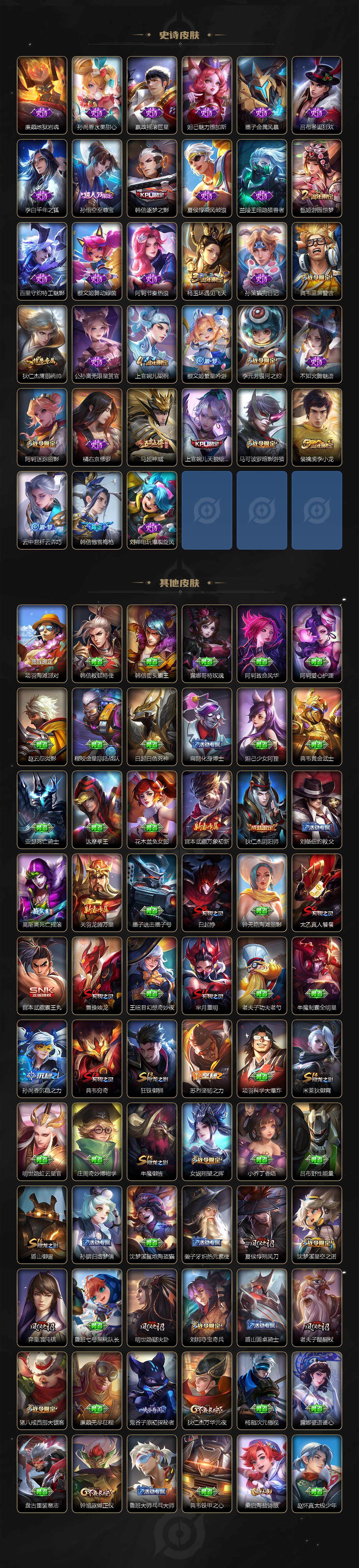 【史诗皮肤】:露娜紫霞仙子,赵云皇家上将,赵云未来纪元,甄姬冰雪圆舞曲,王昭君偶像歌手,狄仁杰魔术师,廉颇地狱岩魂,孙尚香水果甜心,嬴政摇滚巨星,妲己魅力维加斯,墨子金属风暴,吕布圣诞狂欢,李白千年之狐,孙悟空至尊宝,韩信逐梦之影,夏侯惇乘风破浪,兰陵王暗隐猎兽者,甄姬游园惊梦,百里守约特工魅影,蔡文姬舞动绿茵,阿轲节奏热浪,杨玉环遇见飞天,孙策猫狗日记,典韦蓝屏警告,狄仁杰鹰眼统帅,公孙离无限星赏官,上官婉儿梁祝,蔡文姬繁星吟游,李元芳银河之约,不知火舞魅语,阿轲迷踪丽影,橘右京修罗,马超神威,上官婉儿天狼绘梦者,马可波罗暗影游猎,裴擒虎李小龙,云中君纤云弄巧,韩信傲雪梅枪,刘禅电玩爆裂旋风