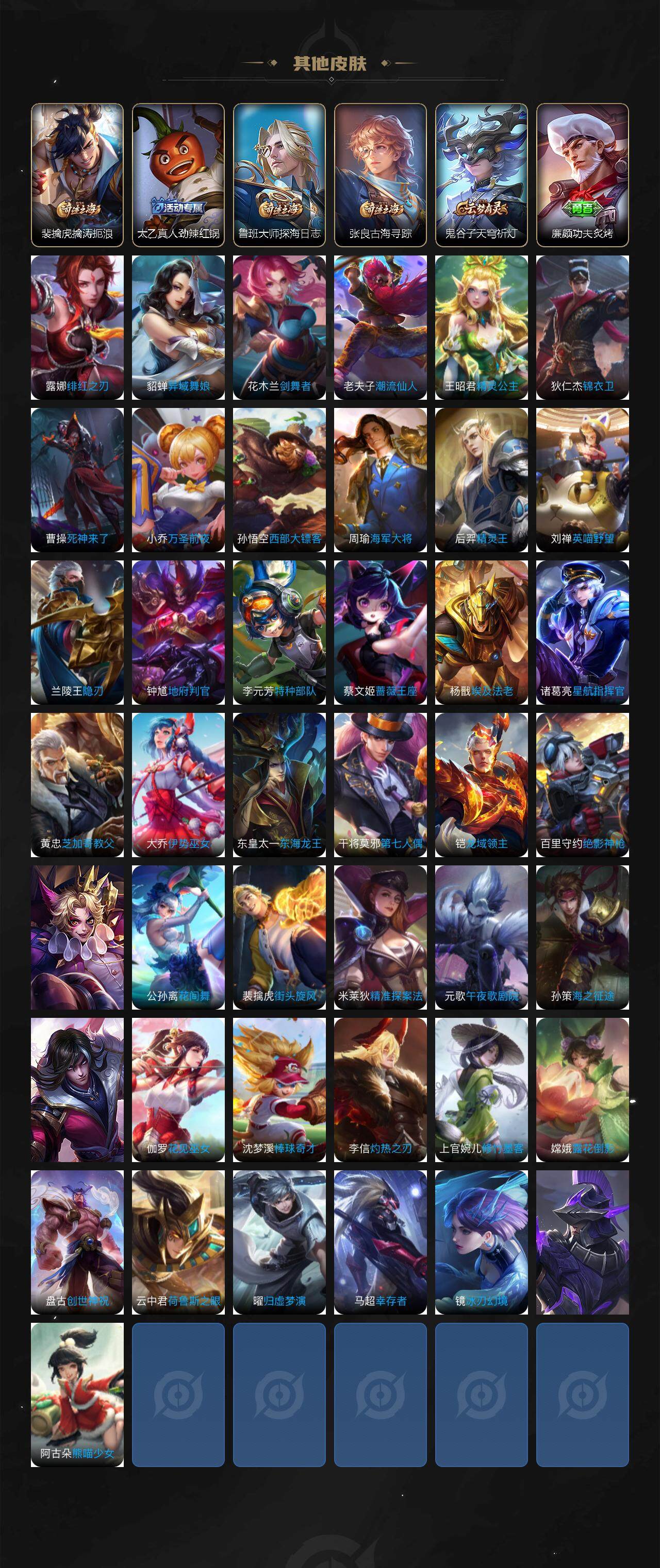 【限定皮肤】:白起狰,狄仁杰阴阳师,赵云皇家上将,高渐离死亡摇滚,阿轲迷踪丽影,芈月重明,夏侯惇朔风刀,甄姬游园惊梦,曹操烛龙,典韦穷奇,典韦蓝屏警告,马可波罗暗影游猎,狄仁杰魔术师,狄仁杰万华元夜,项羽海滩派对,老夫子醍醐杖,刘邦夺宝奇兵,韩信逐梦之影,韩信傲雪梅枪,孙悟空至尊宝,牛魔御旌,李元芳银河之约,钟馗驱傩正仪,杨玉环遇见飞天,女娲朔望之晖,蔡文姬繁星吟游,太乙真人饕餮,鬼谷子原初探秘者,百里玄策白虎志,弈星混沌棋,沈梦溪星空之诺,明世隐疑决卦,裴擒虎李小龙,裴擒虎擒涛扼浪,狂铁御狮,米莱狄御霄,云中君纤云弄巧,盾山御銮,猪八戒西部大镖客,上官婉儿梁祝,上官婉儿天狼绘梦者,鲁班大师探海日志,桑启海盐诗旅,张良古海寻踪,鬼谷子天穹祈灯
