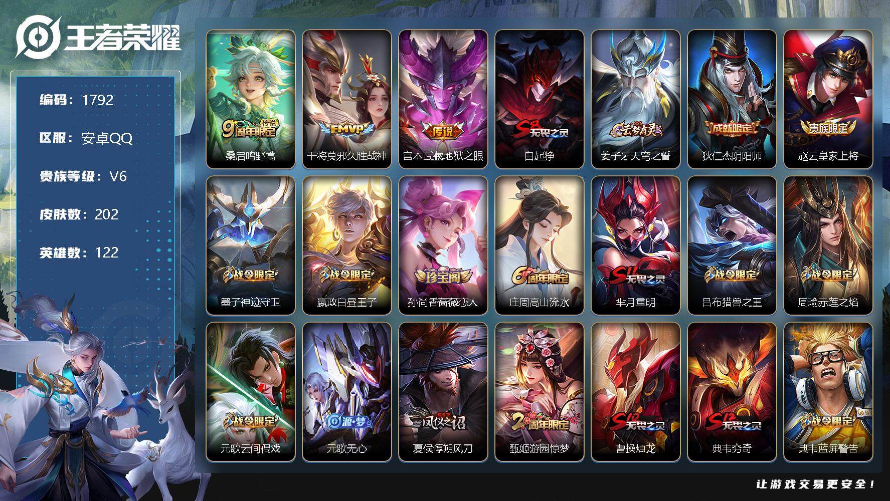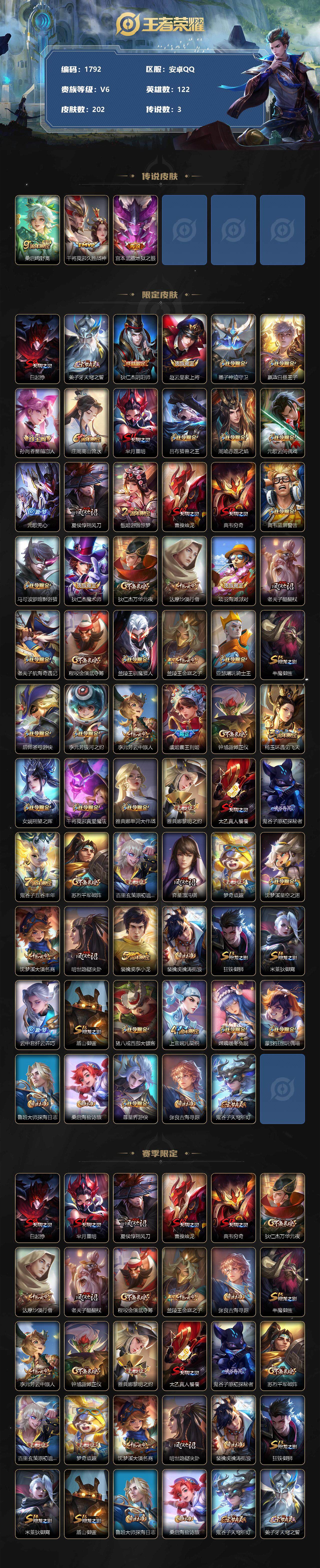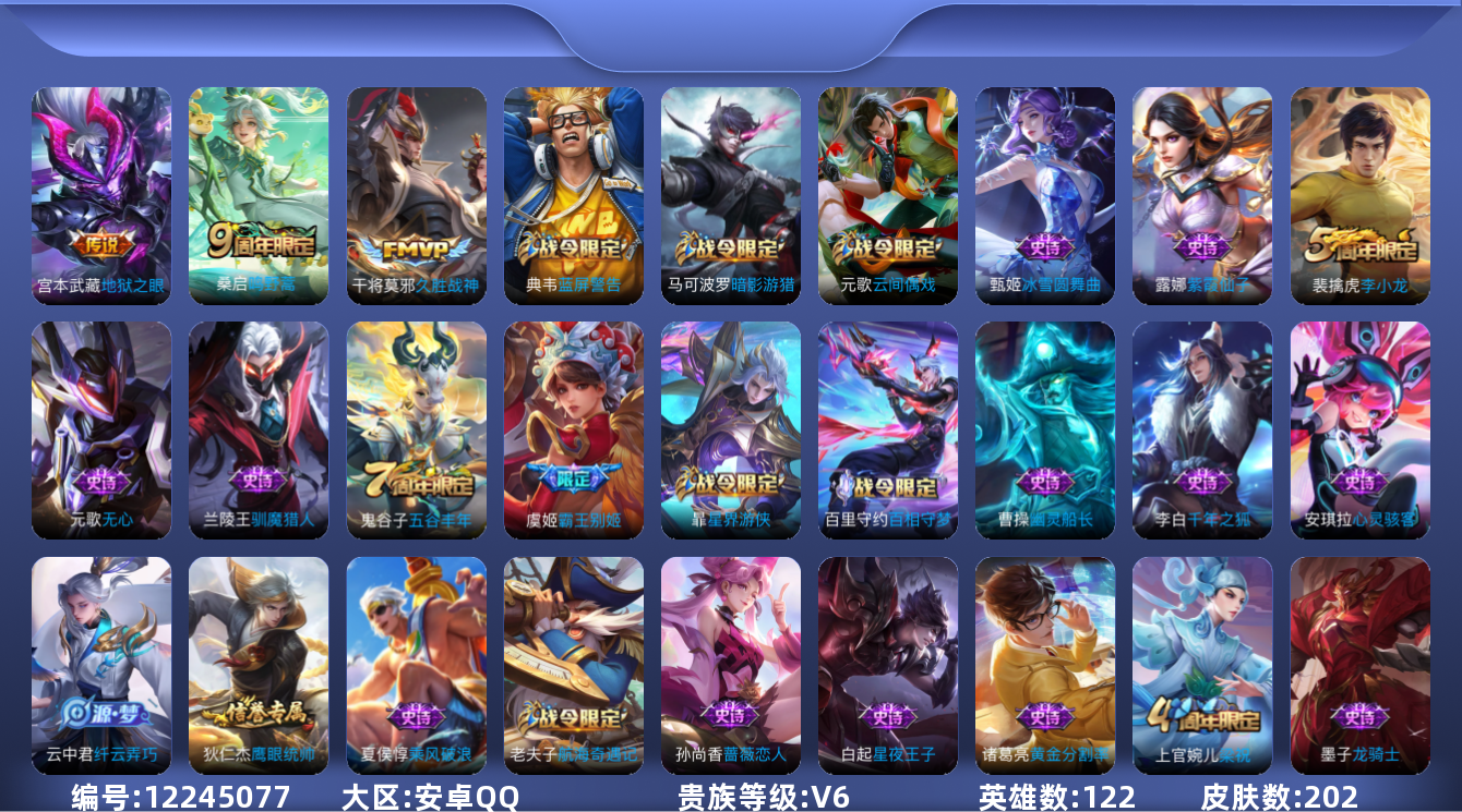 [12245077]【商品标题】:安卓Q-V3-尊贵铂金I段位-122英雄-202皮肤-0典藏-0珍品无双-0无双-0珍品传说-3传说-51史诗