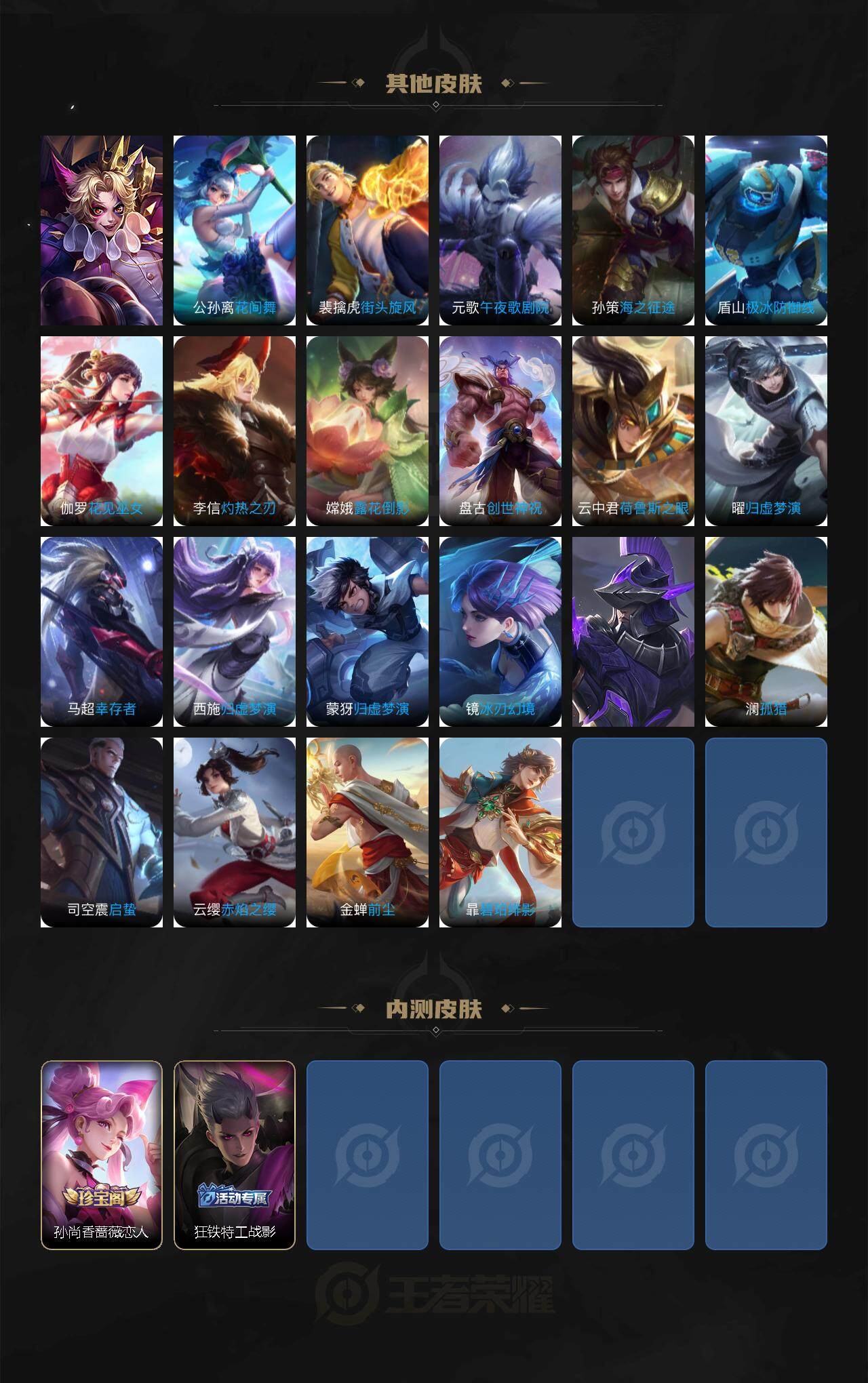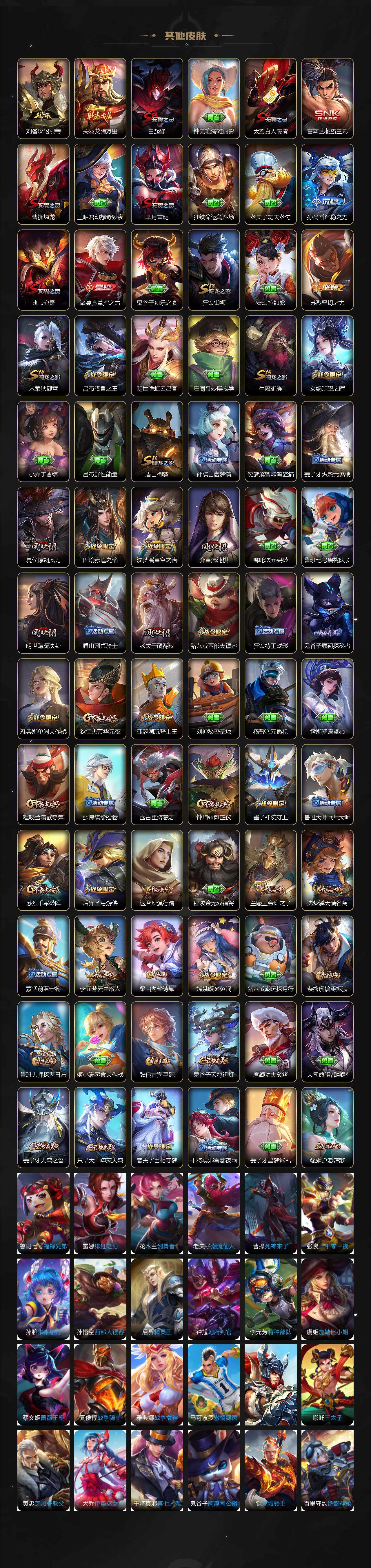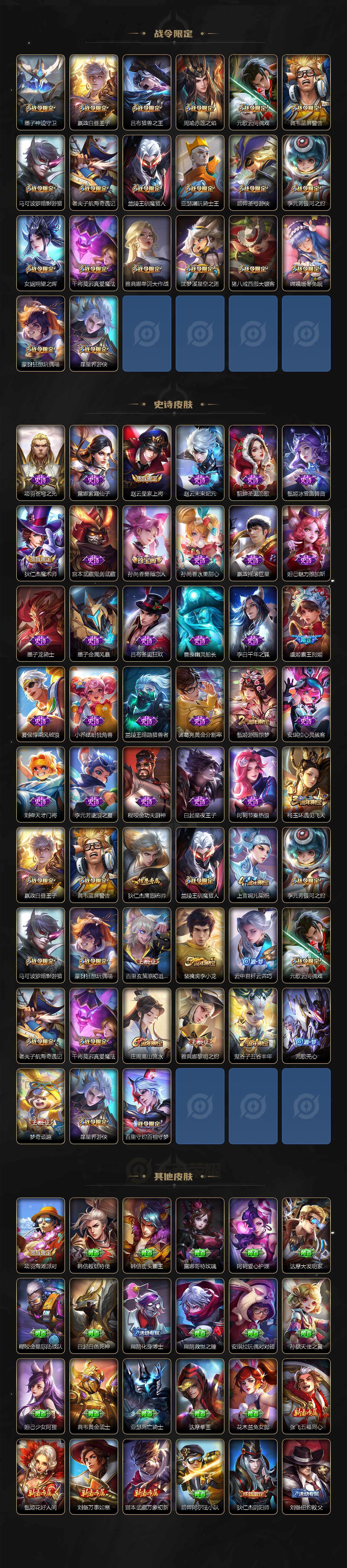【限定皮肤】:白起狰,姜子牙天穹之誓,狄仁杰阴阳师,赵云皇家上将,墨子神迹守卫,嬴政白昼王子,孙尚香蔷薇恋人,庄周高山流水,芈月重明,吕布猎兽之王,周瑜赤莲之焰,元歌云间偶戏,元歌无心,夏侯惇朔风刀,甄姬游园惊梦,曹操烛龙,典韦穷奇,典韦蓝屏警告,马可波罗暗影游猎,狄仁杰魔术师,狄仁杰万华元夜,达摩沙漠行僧,项羽海滩派对,老夫子醍醐杖,老夫子航海奇遇记,程咬金演武夺筹,兰陵王驯魔猎人,兰陵王金庭之子,亚瑟潮玩骑士王,牛魔御旌,后羿圣弓游侠,李元芳银河之约,李元芳云中旅人,虞姬霸王别姬,钟馗驱傩正仪,杨玉环遇见飞天,女娲朔望之晖,干将莫邪真爱魔法,雅典娜单词大作战,雅典娜黎明之约,太乙真人饕餮,鬼谷子原初探秘者,鬼谷子五谷丰年,苏烈千军破阵,百里玄策原初追逐者,弈星混沌棋,梦奇顽趣,沈梦溪星空之诺,沈梦溪大漠名商,明世隐疑决卦,裴擒虎李小龙,裴擒虎擒涛扼浪,狂铁御狮,米莱狄御霄,云中君纤云弄巧,盾山御銮,猪八戒西部大镖客,上官婉儿梁祝,嫦娥暖冬兔眠,蒙犽狂想玩偶喵,鲁班大师探海日志,桑启海盐诗旅,暃星界游侠,张良古海寻踪,鬼谷子天穹祈灯