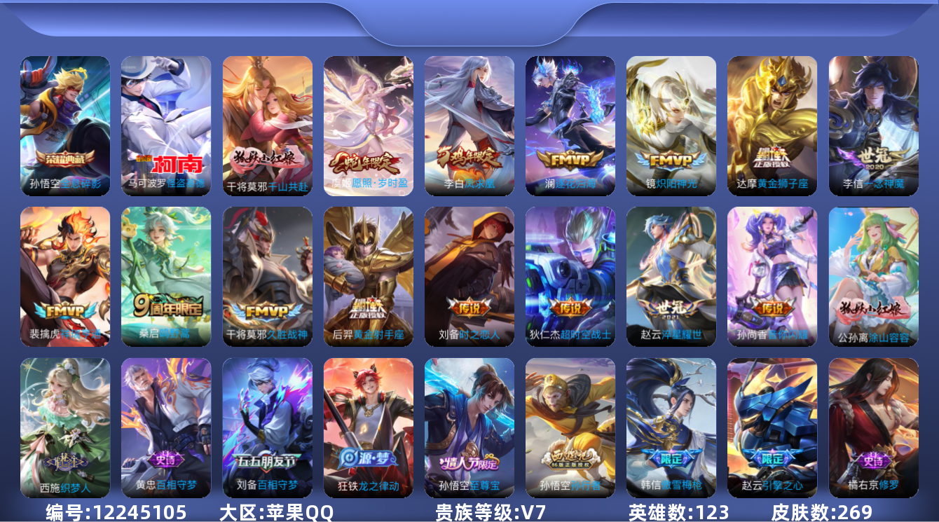 [12245105]V7 1典藏 1珍品传说 15传说 123英雄 269皮肤 可修改实名 优质装备:全息碎影(猴子典藏),怪盗基德,黄金狮子座,黄金射手座,久胜战神,炽阳神光,一念神魔,时之恋人-刘备(电焊工),淬星耀世,超时空战士-狄仁杰,音你闪耀(rap皮),澜逐花归海,千山共赴,涂山容容 传说皮:祥瑞亨通 珍宝阁皮:胡桃夹子,万物之道 限定皮:愿照·岁时盈(虞姬年限),逐霄战戟,鸣野蒿,至尊宝,凤求凰(白切鸡),傲雪梅枪,五谷丰年,李小龙,孙行者,引擎之心 史诗皮:星界战将,龙之律动,茶境仙,怒海争锋,破空之剑,蔬乡物语(鲁班七号),百相守梦-百里守约,星界特工,百相守梦-黄忠,织梦人,紫霞仙子,苍穹之光,黄金分割率,特工魅影,千年之狐,江河有灵,高渐离燃音魔法,蒙恬荣光圣徽,冰冠公主,青蛇,电玩·爆裂旋风,百相守梦(刘备),猫狗日记-孙策,乱世虎臣,节奏热浪,修罗,水果甜心,天才门将,星夜王子,心灵骇客,德古拉伯爵,暗隐猎兽者,幽灵船长,鬼剑武藏,暗渊魔法,天秀·启明,地狱岩魂,缤纷独角兽,乘风破浪,逐浪之夏,水晶猎龙者,曙光守护者,箭羽风息,金属风暴,原初追逐者,圣诞狂欢,圣诞恋歌,鹰眼统帅,魅力维加斯,黎明之约,未来纪元-赵云