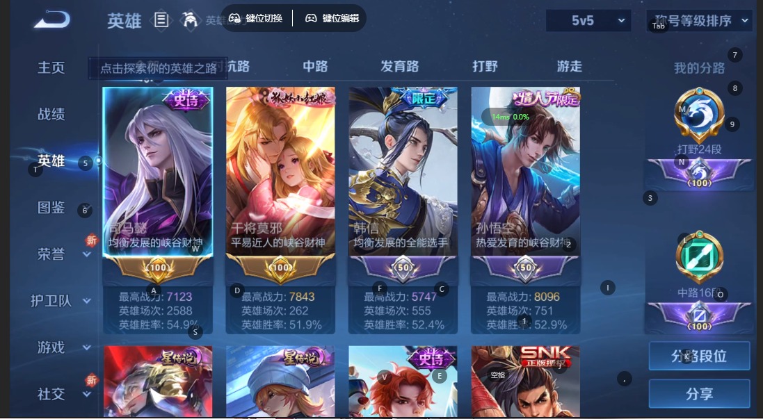 - PX_2103290-实名: 可修改 贵族等级: V6 英雄数: 124 皮肤数: 146 珍品传说: 器灵·落星盏 传说皮: 仲夏夜之梦,音你心动-小乔,貂蝉曦玄引,黄金天蝎座,幻光神枪 限定皮: 高山流水,玉兔公主,至美·乘鲤谣,鸣野蒿,愿照·众生和