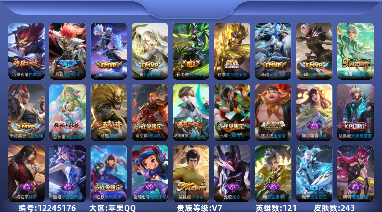 [12245176]【商品标题】:苹果Q-V7-尊贵铂金IV段位-121英雄-243皮肤-0典藏-0珍品无双-0无双-0珍品传说-10传说-77史诗