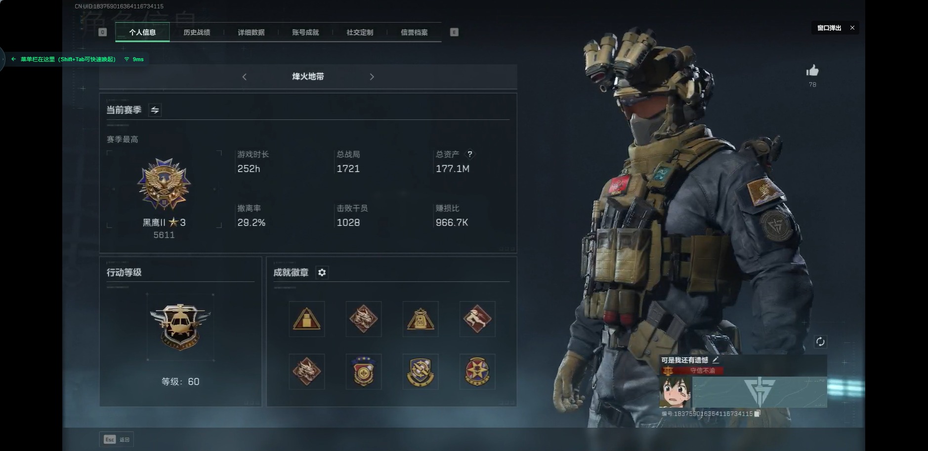 [12204671]总资产:177.1M 1干员外观 1近战传说 11传说枪械 哈夫币:29.584K 可二次 可修改实名 优质装备:近战-黑海 烽火地带段位:黑鹰 全面战场段位:列兵 传说武器皮肤:勇士冲锋枪-能天使-午夜邮差,M4A1突击步枪-阿米娅,CAR-15突击步枪-阿米娅,复合弓-黑-天际线,UZI冲锋枪-特斯拉线圈,AWM狙击步枪-捞点薯条,腾龙突击步枪-捞点薯条,AK-12突击步枪-特斯拉线圈,SR-3M紧凑突击步枪-特斯拉线圈,AK-12突击步枪-夜鹰 史诗武器皮肤:AUG突击步枪-蝮蛇,PKM通用机枪-蝮蛇,PTR-32突击步枪-英雄,SV-98狙击步枪-林中猎手,SV-98狙击步枪-囚徒,M16A4突击步枪-竞赛选手,M1014霰弹枪-林中猎手,PKM通用机枪-守夜人,沙漠之鹰-曙光,QBZ95-1突击步枪-曙光,AS Val突击步枪-尖端治疗,M700狙击步枪-竞技风,M700狙击步枪-守夜人,SG552突击步枪-尖端治疗,Ash-12战斗步枪-守夜人,SR-25射手步枪-尖端治疗,MP5冲锋枪-深海恐惧,勇士冲锋枪-深海恐惧,AKM突击步枪-林中猎手,.357左轮-幸运时刻,M14射手步枪-黑鹰坠落 干员外观:露娜-黑·天际线1