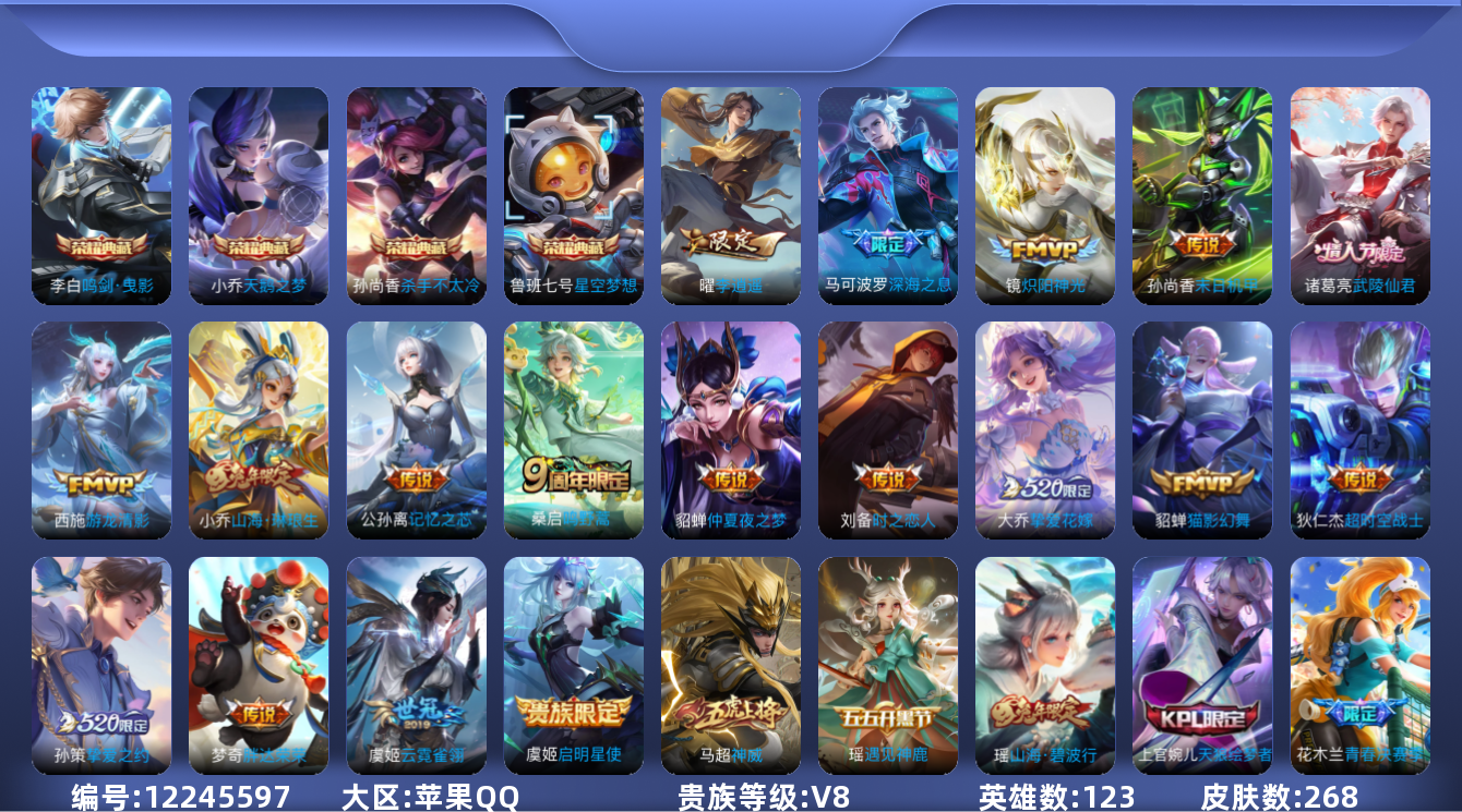 [12245597]【商品标题】:苹果Q-V8-永恒钻石V段位-123英雄-268皮肤-4典藏-0珍品无双-0无双-0珍品传说-18传说-77史诗