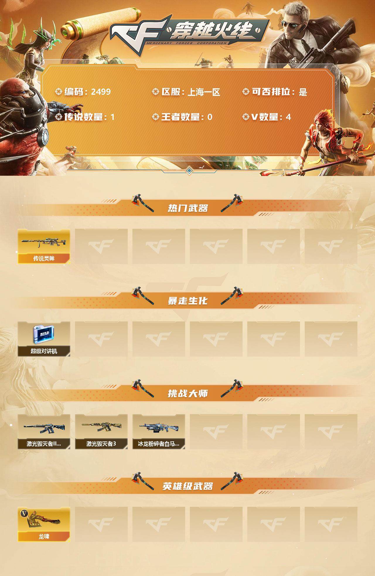 [12246290]【商品标题】:上海一区-4V-0王者-0炫金 【传说武器】:传说灵眸 【热门武器】:传说灵眸 【暴走生化】:超级对讲机 【挑战大师】:激光毁灭者III,激光毁灭者III-白马银枪,冰龙粉碎者-白马银枪 【英雄级武器】:龙啸 【特殊枪械】: